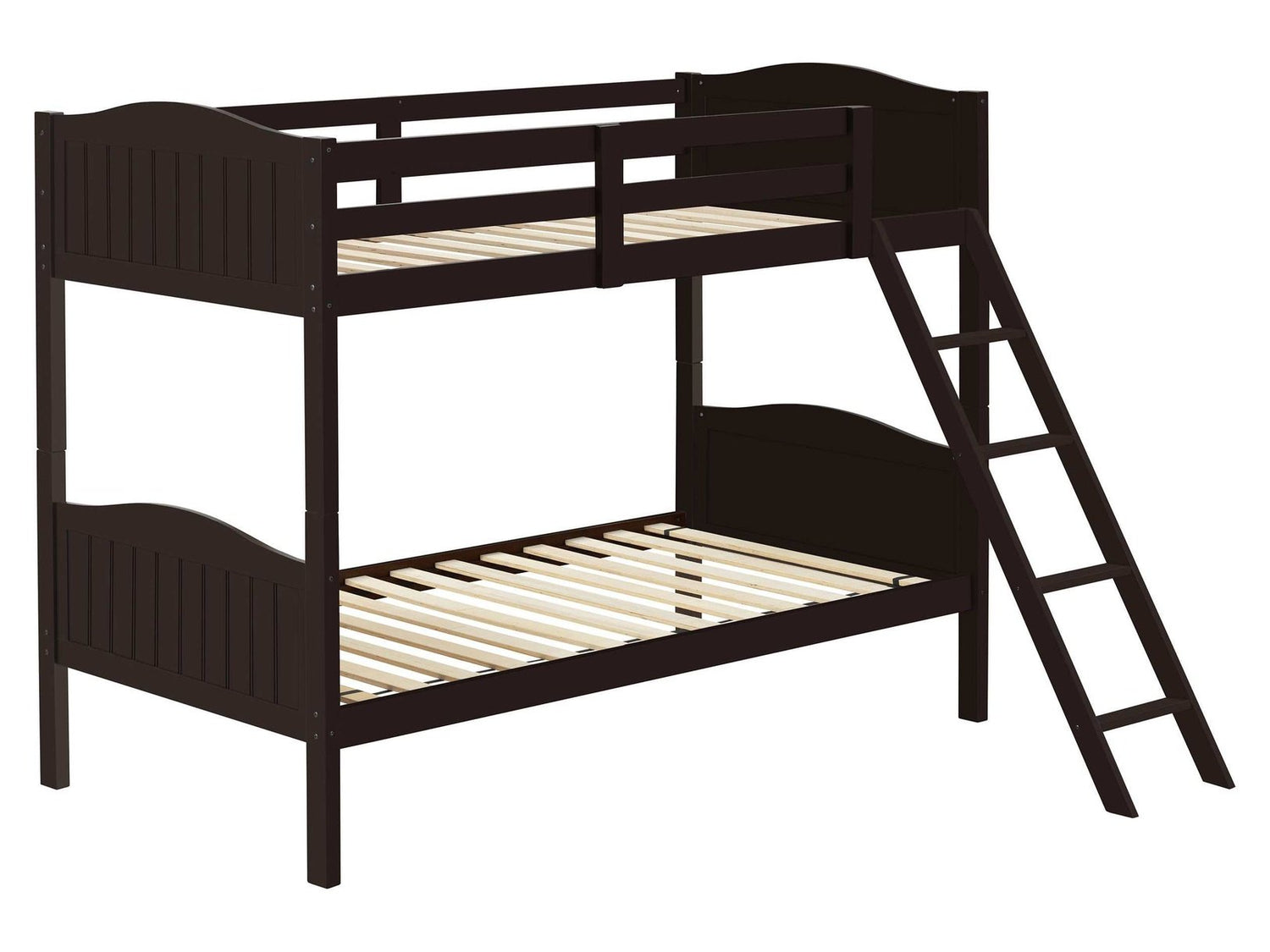 Create more floor space in your kid's room with this simple, yet modern bunk bed. Available in several colors, this bunk bed can lend to any room's current color palette. The camelback headboard and footboard offer a plank style look, along with a square, straight frame silhouette. An angled ladder allows kids to get to the top bunk, which also offers secure guardrails on each side. Place this bunk bed in siblings' shared bedroom space to accommodate more room.