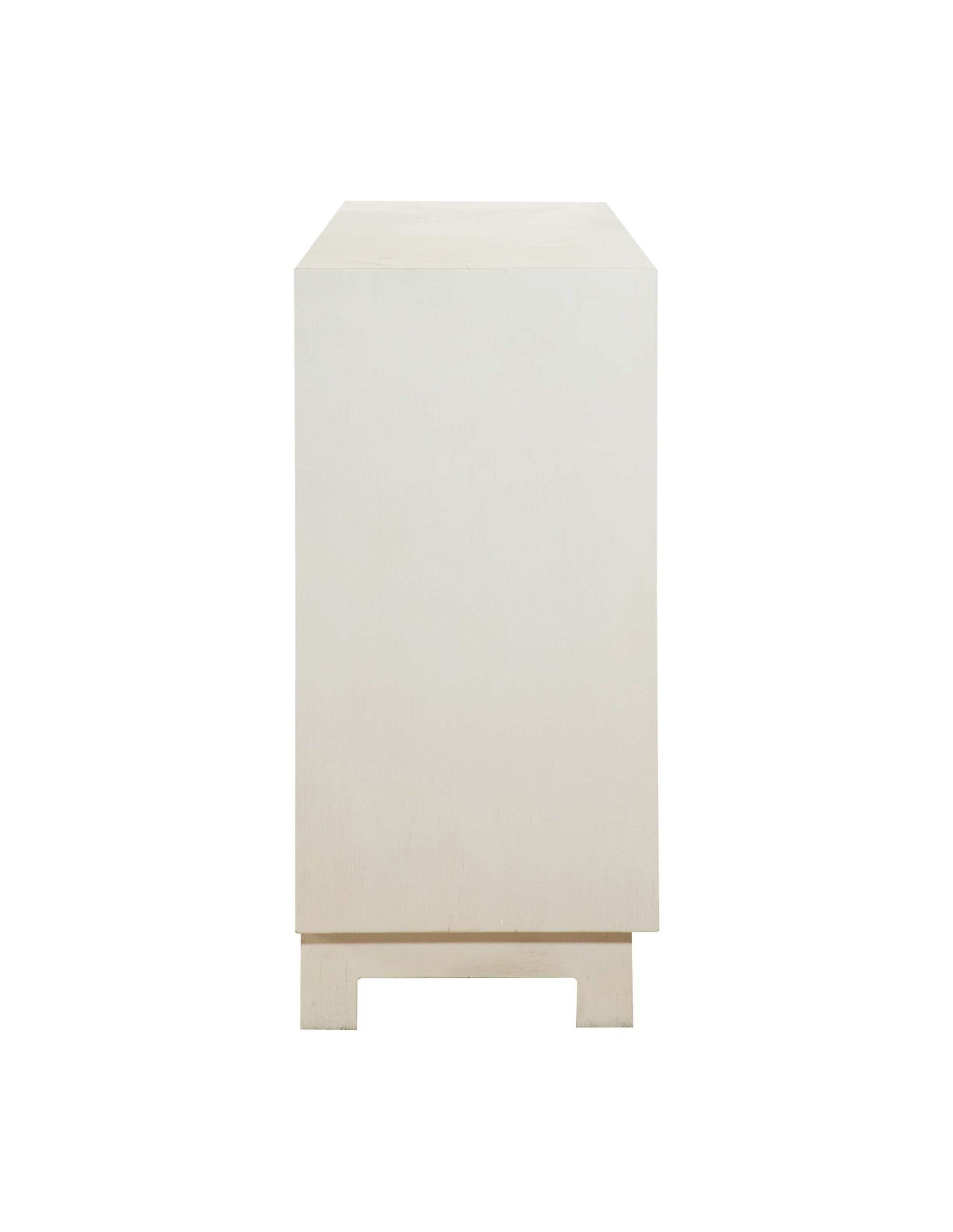 For an accent table that strikes up an instant conversation, you can't go wrong with this piece. A Greek key design on the cabinet door panels add texture and pizzazz. The white, gold, and silver color palette makes an immediate upgrade inside your home. Find plenty of storage space within the four cabinet doors and three interior shelves inside. This accent cabinet is supported on block style legs.