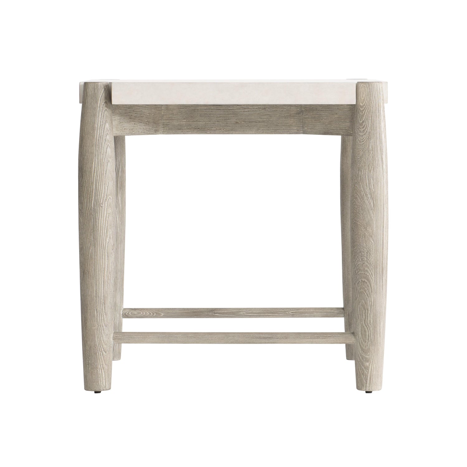 - Sandblasted ash wood base with round legs and stretchers in Weathered Greige finish