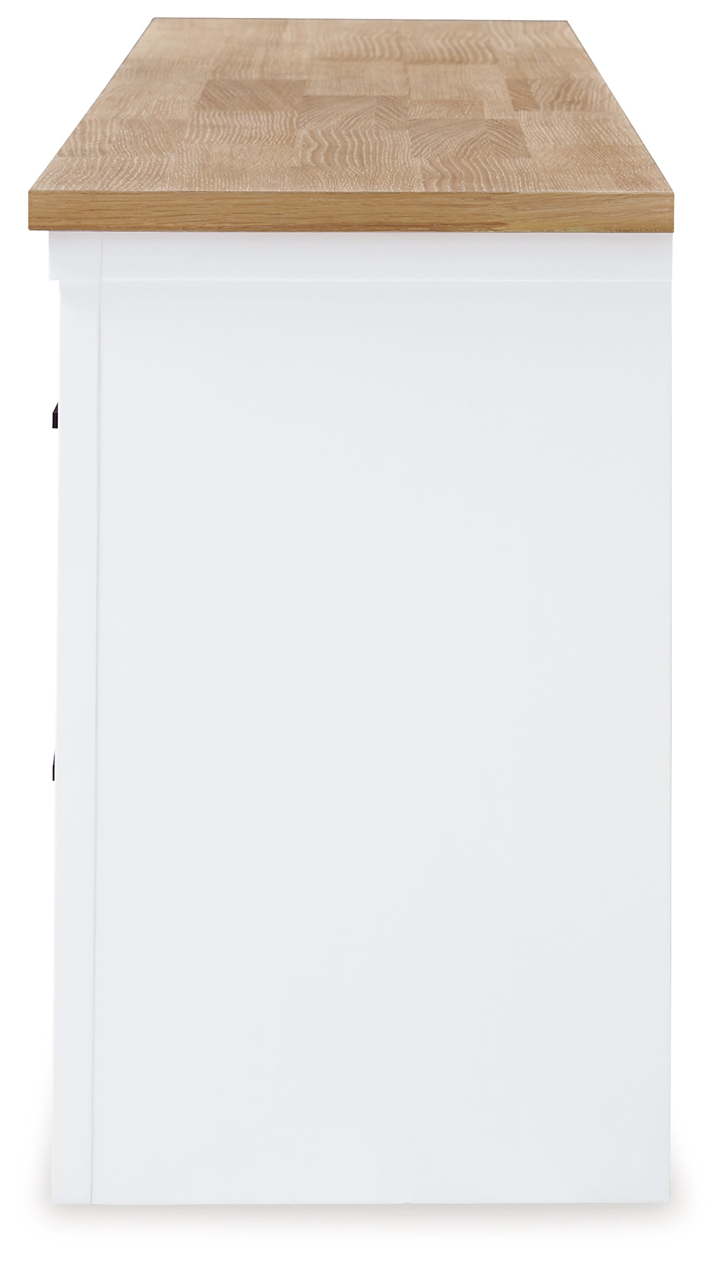Casual style with substance. This two-tone TV stand raises the bar on comfortably cozy design. A sturdy silhouette with a butcher block oak veneer top, classic white finish and contemporary black metal hardware exude modern farmhouse vibes. Spacious cabinets, display shelves and drawers let you tuck away entertainment essentials while displaying treasures in this charmingly curated piece. Cutouts for wire management help keep the look relaxed and uncluttered.