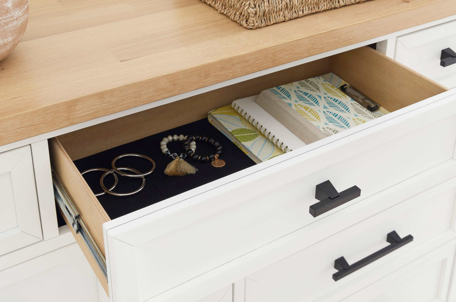 - Dresser with 2-tone finish (white finish; butcher block oak veneer with natural finish)