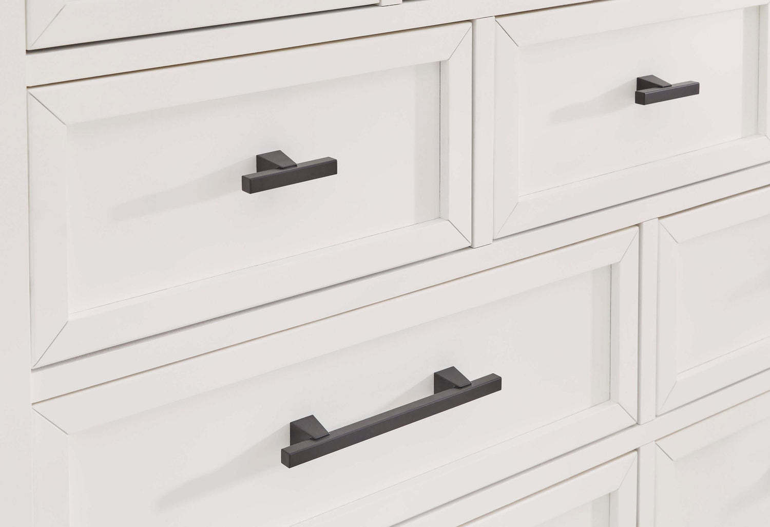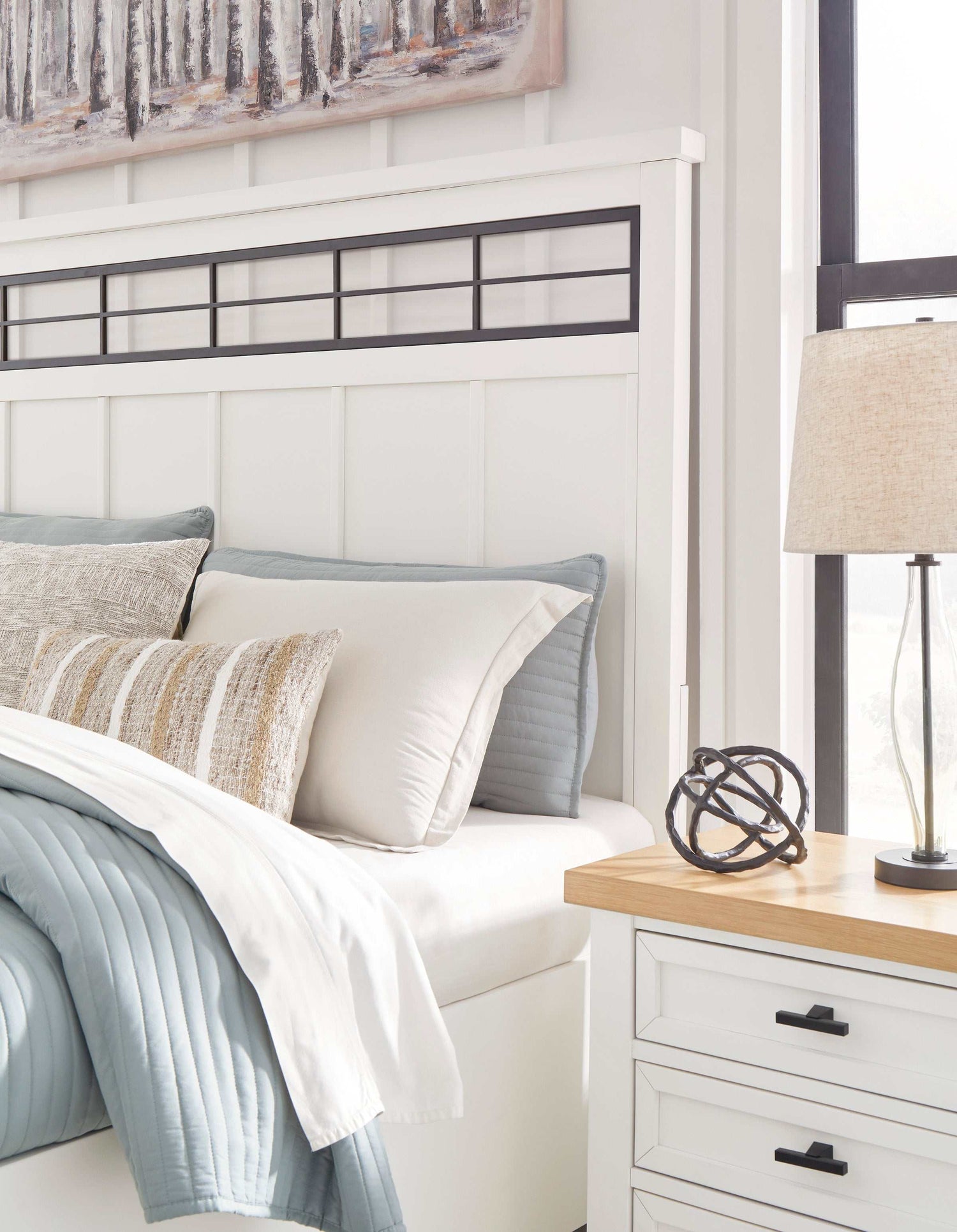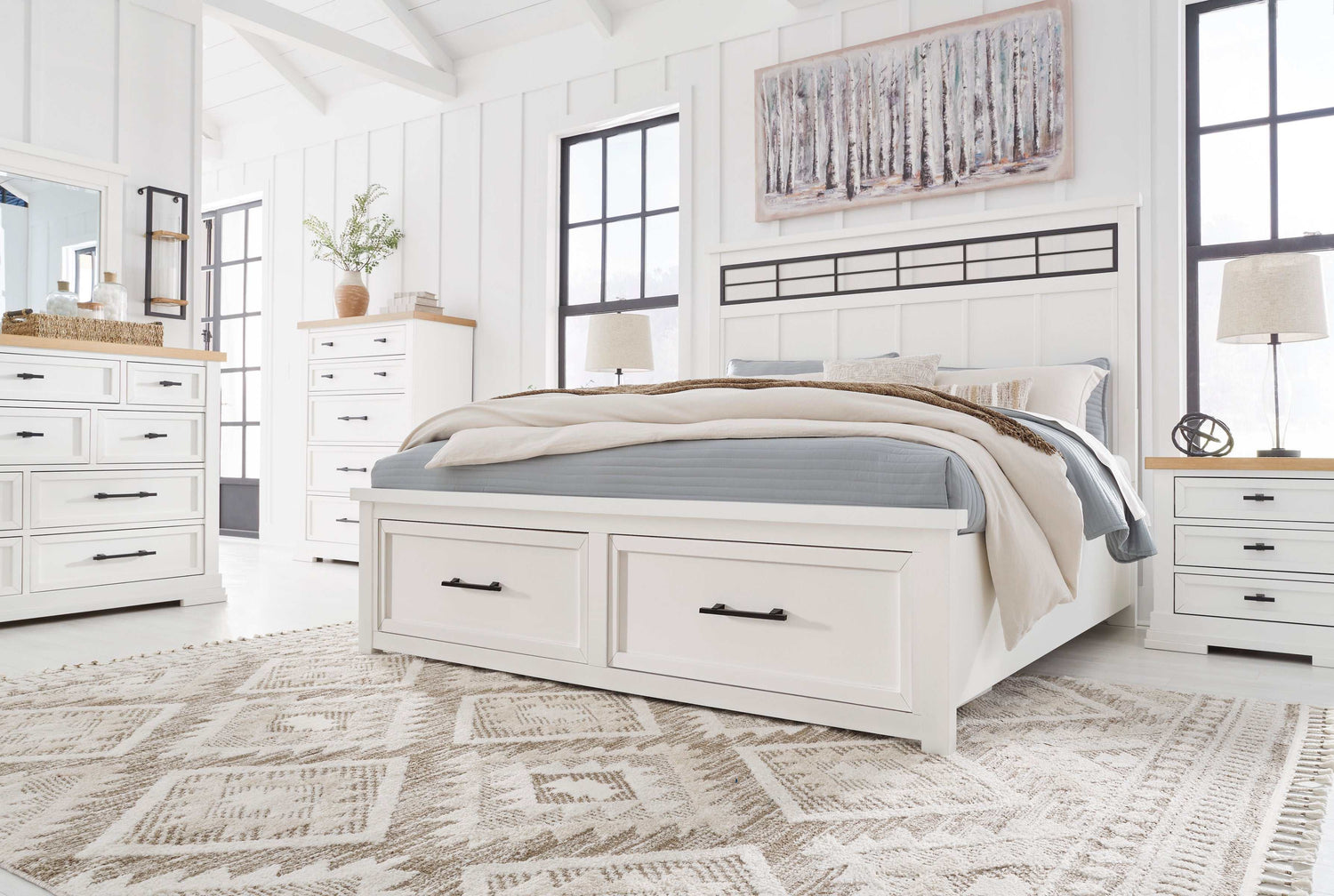 This queen-panel storage bedroom package delivers casual style with substance. An inset metal detail on the headboard displays a unique take on modern farmhouse design. The bed's sturdy silhouette, classic white finish, and black pulls exude a comfortably cozy vibe in your soothing sanctuary. Storage drawers are spacious enough for all your essentials. This two-tone nightstand raises the bar on comfortably cozy design in your soothing sanctuary. Bedside charging for your go-to devices is made easy with power outlets and USB ports.