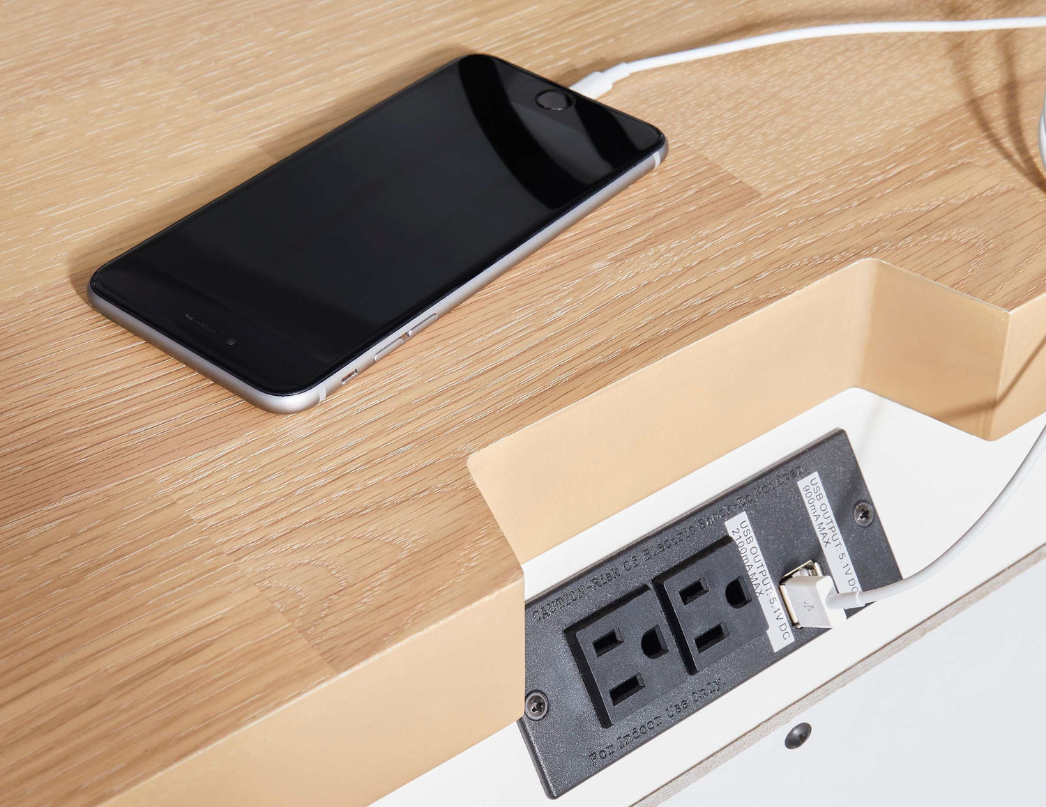 - Bed: The headboard and footboard are made with hardwood solids, MDF substrates, and butcher block oak veneer