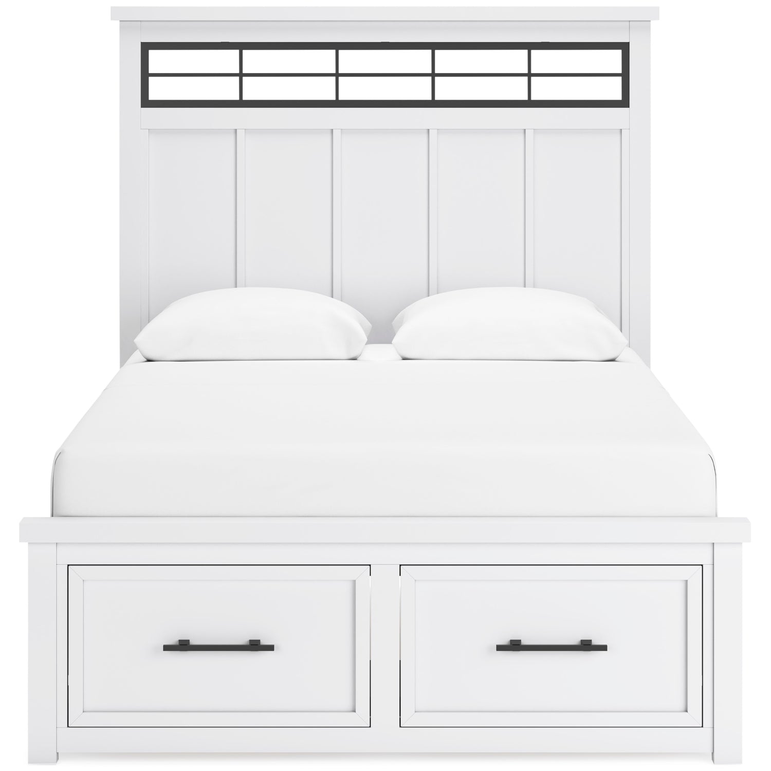 This queen-panel storage bed delivers casual style with substance. An inset metal detail on the headboard displays a unique take on modern farmhouse design. The bed's sturdy silhouette, classic white finish, and black pulls exude a comfortably cozy vibe in your soothing sanctuary. Storage drawers are spacious enough for all your essentials.