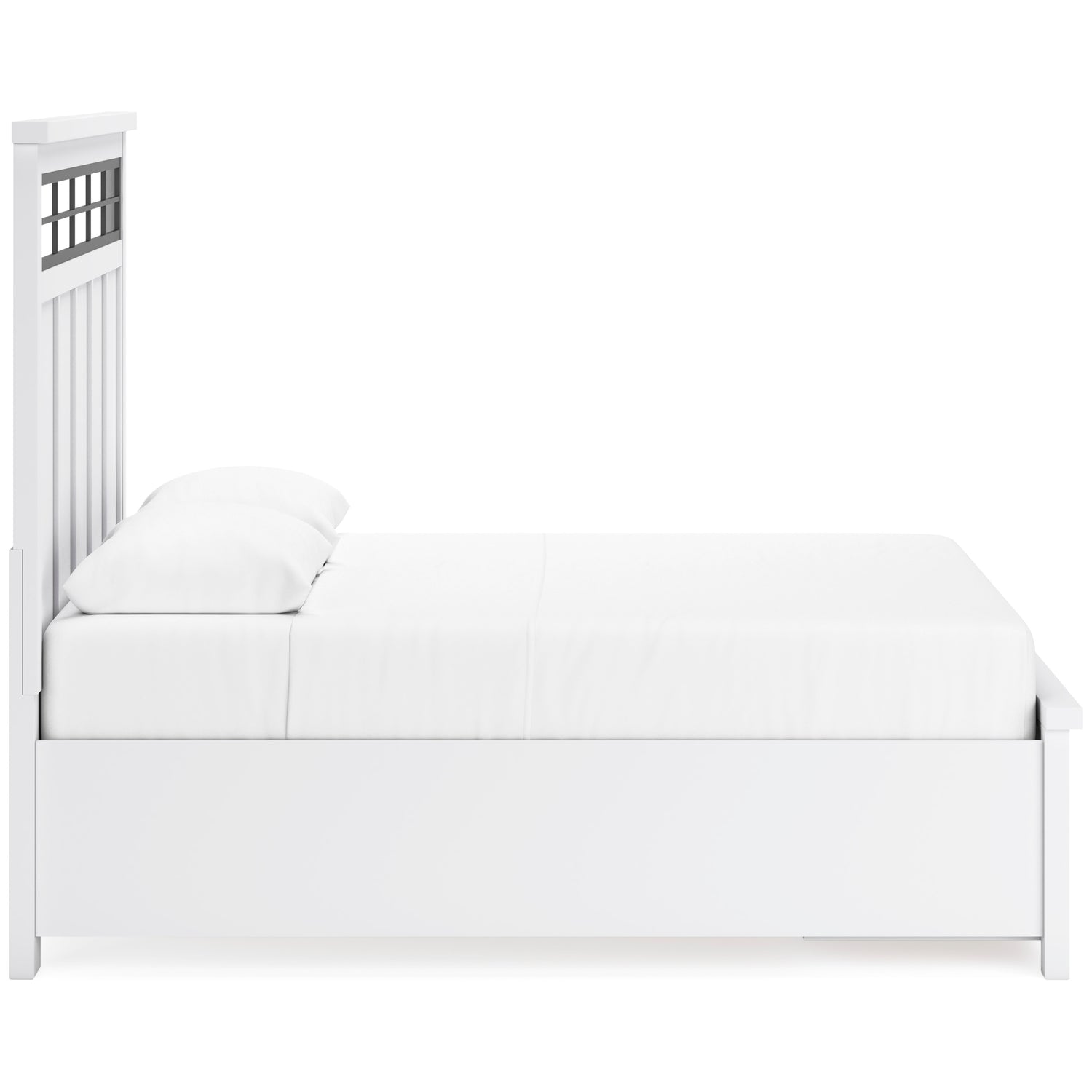 - Queen Panel Storage Bed Includes; panel headboard, storage footboard, rails, and roll slats.