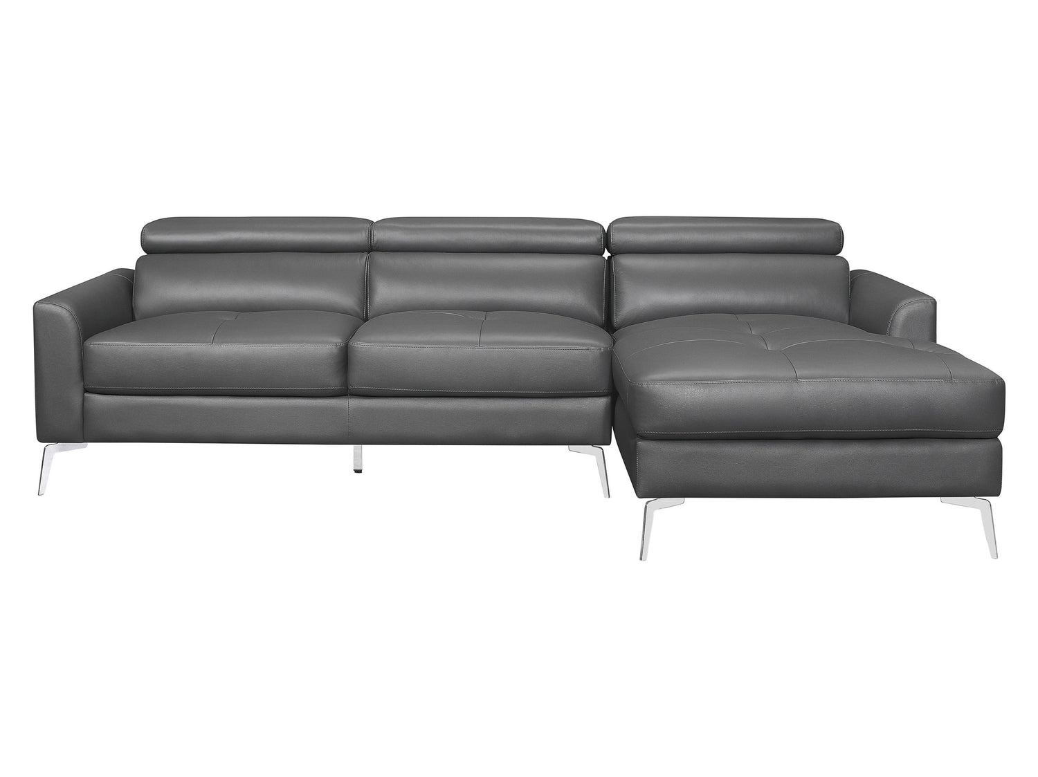 Contemporary design is utilized to create the look of the Ashland Collection. The two-piece sectional features left-side two-seat configuration paired with a right-side chaise. Chrome legs provide support and lend accent to the dark gray top-grain leather with faux leather match covering.