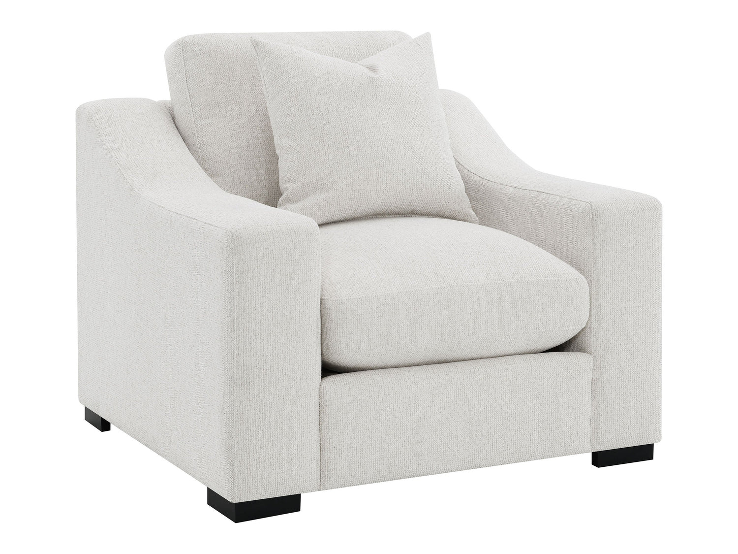 - Accent chair with track arms and plush silhouette wrapped in sand textured upholstery,