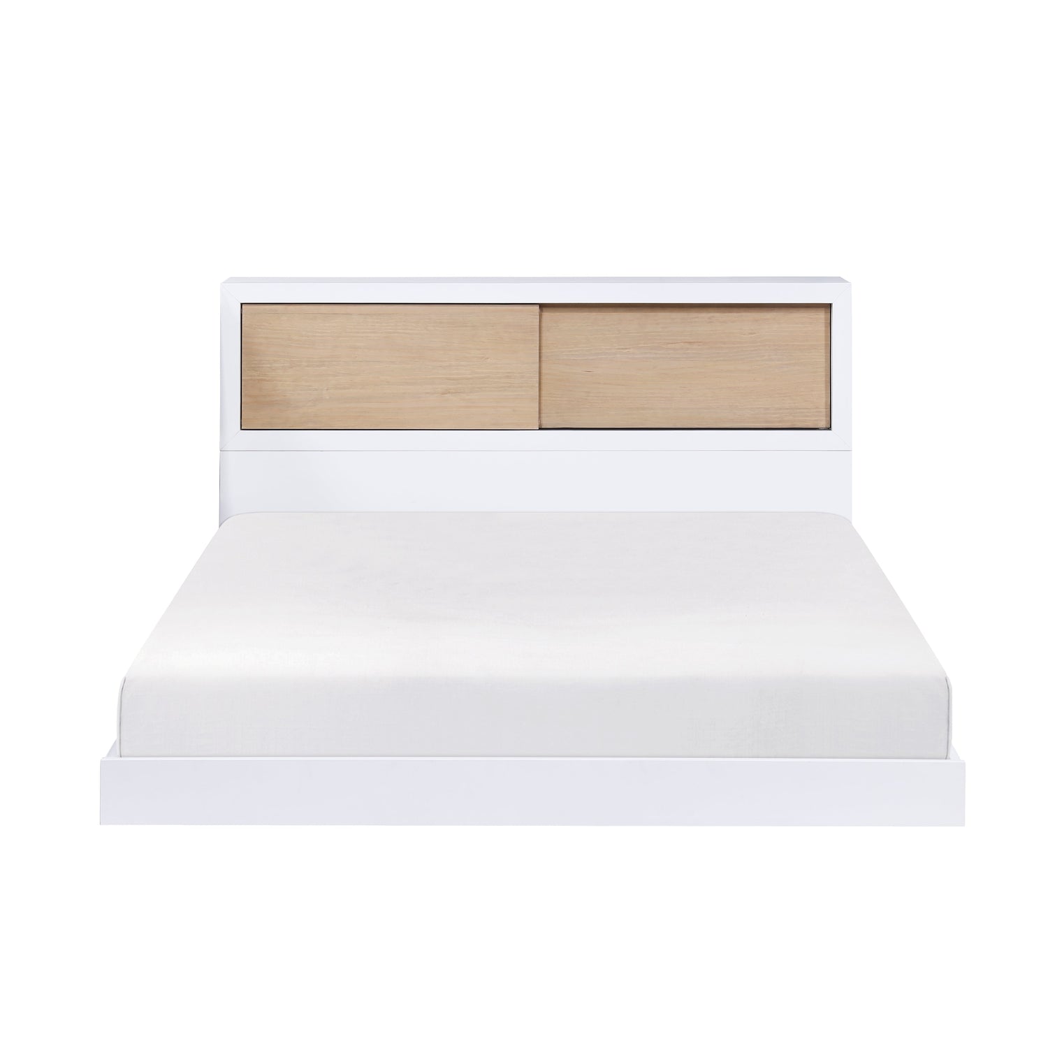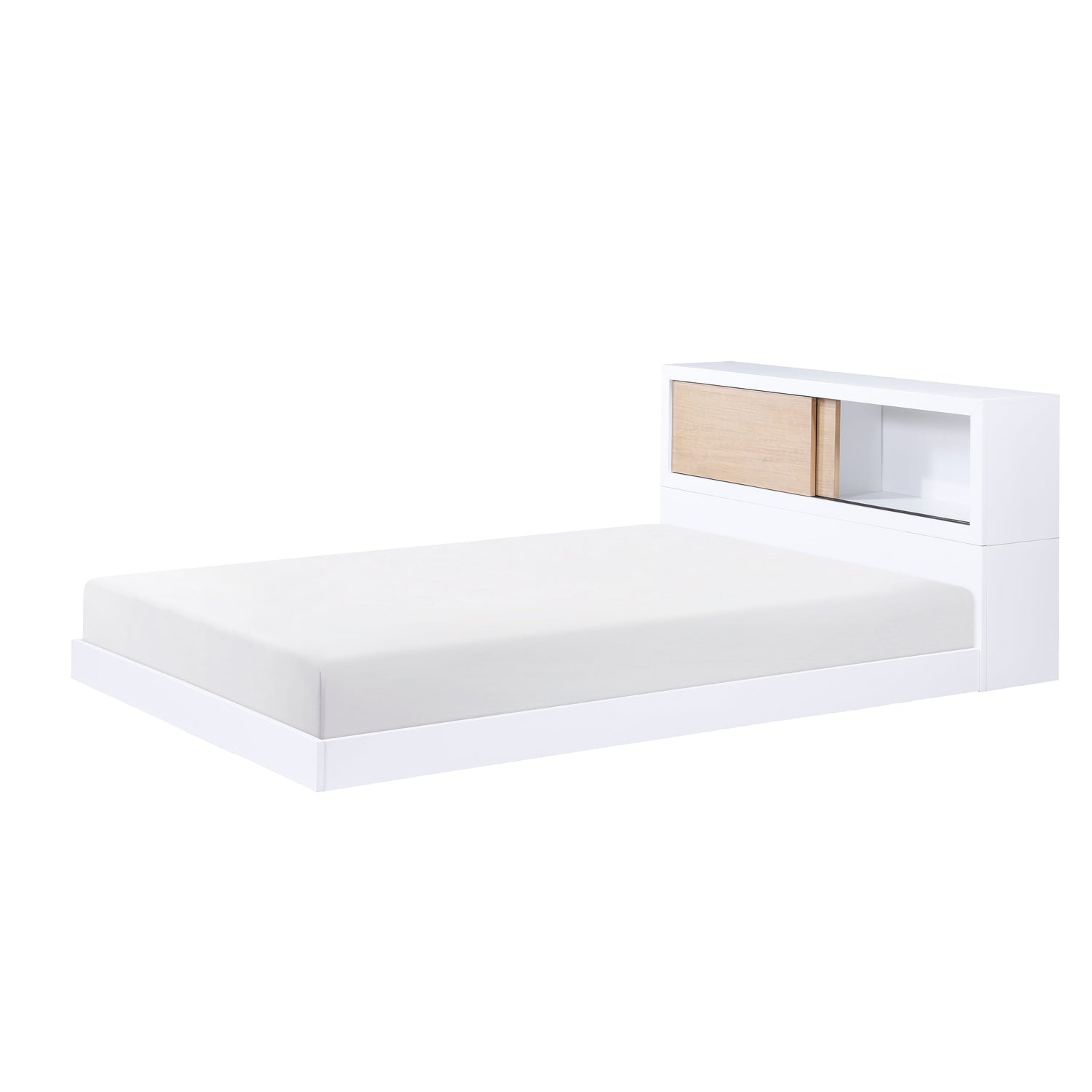 Providing the perfect landing pad for your child’s bedroom, the Asker Collection is a fun and functional addition to their space. The two-tone white and natural finish of the pine veneer is paired with the mid-century modern design to create a classic profile. The full-size bed’s floor level ultra-low profile platform features a sliding door bookcase headboard which provides an enclosed storage space.