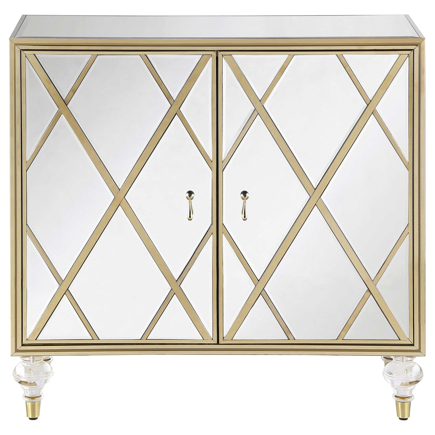 Polished materials and luxe accents combine to create this stunning, glam accent cabinet. Covered almost entirely in mirror surfaces, this accent cabinet boasts a latticed design in the dual cabinet doors, inset with a champagne diamond pattern. The shimmering champagne finish carries through in the borders, traditional teardrop pendant hardware and capped feet. Store personal effects inside, organized on the two shelves. Supported by elegantly turned acrylic legs that offer a transparent look, this accent chest exudes a regal, refined aesthetic.