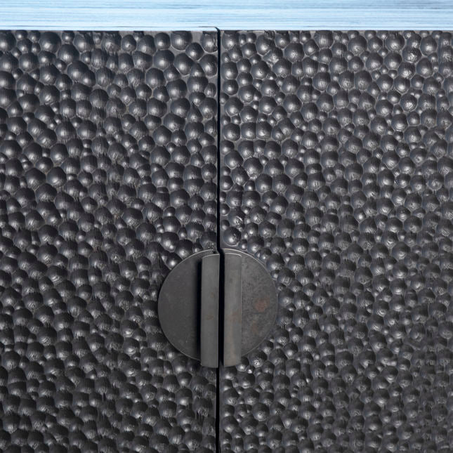 Give guests something to talk about with this beautiful 79' Athens Sideboard. Made of reclaimed pine wood and finished in a rich black stain, the unique door-front texture will beg to be touched. The four door fronts are complimented by striking semi-circular iron handles for easy opening. The interior boasts 2 large storage shelves for all your entertainment needs.