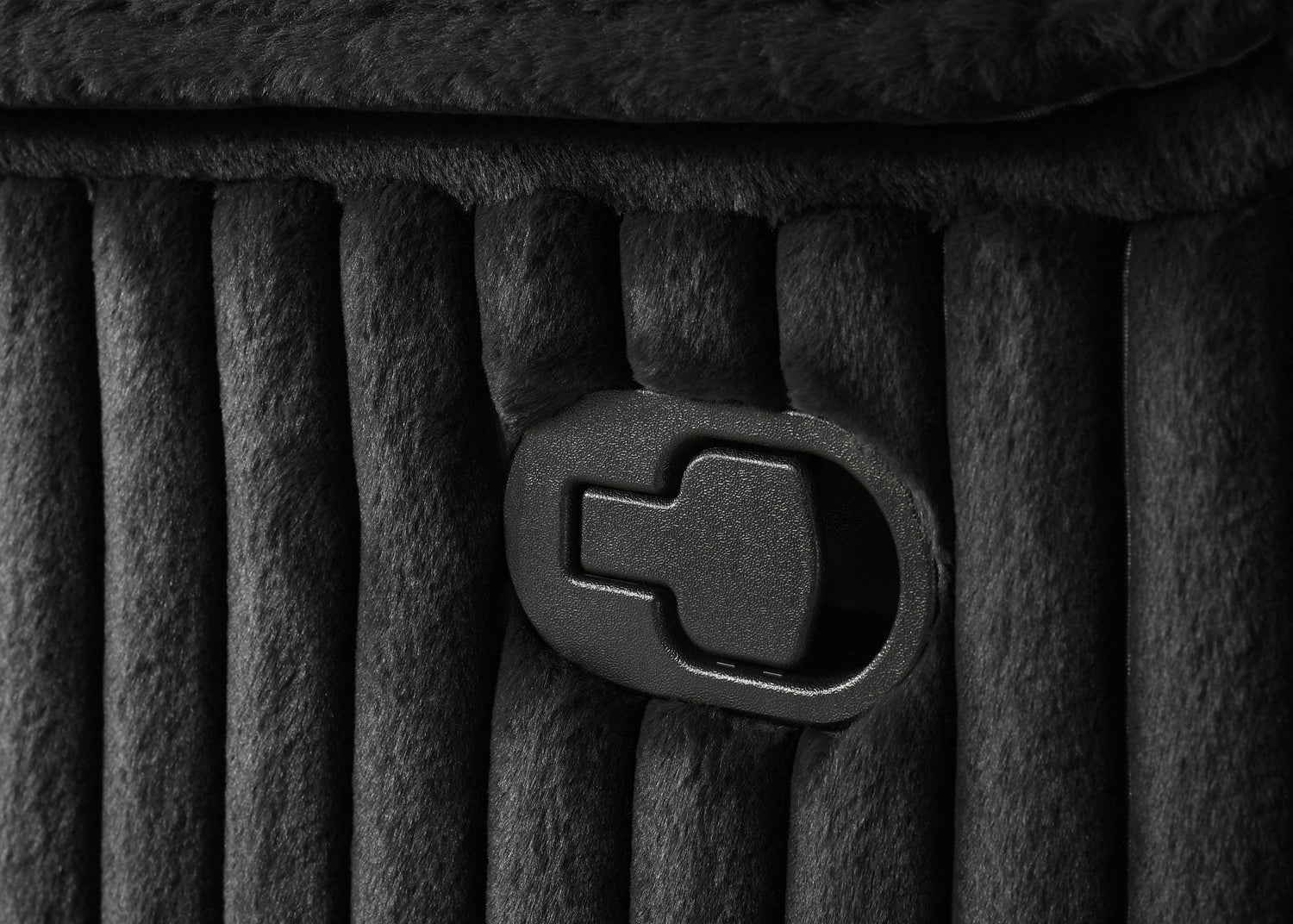 - Black wide-wale corduroy upholstery offers soft velvety texture and elevated visual interest,