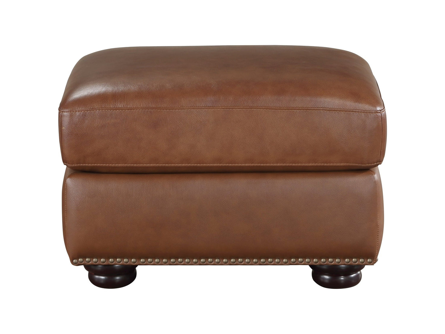 The traditional style of your home is perfectly complemented by the addition of the Attleboro Collection. Whether used as seating or as a footrest, the ottoman is covered with camel brown top-grain leather where the hand touches, and faux leather-match covering the remaining areas. The base rail of the ottoman accented with nailhead trim.