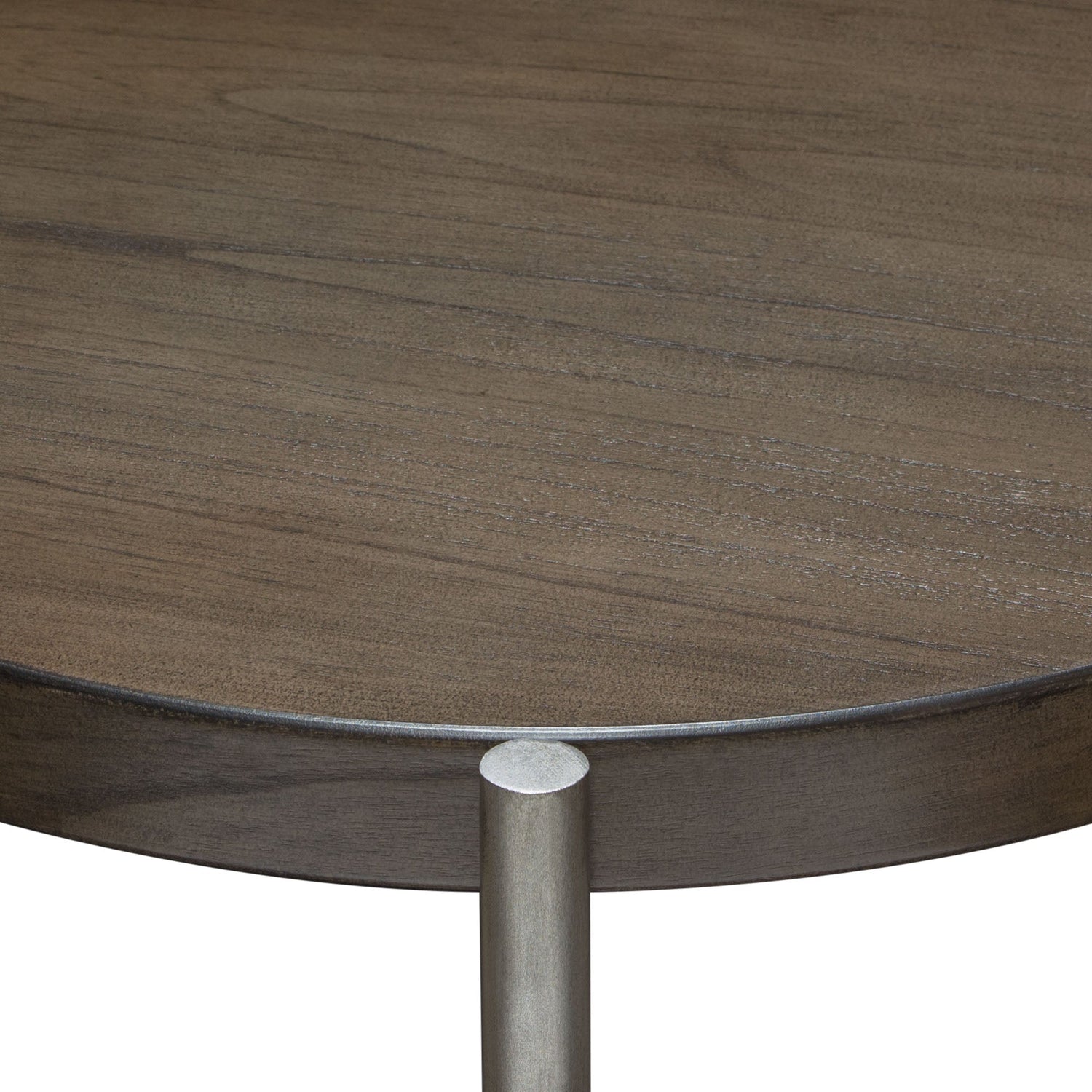 - The Grey Oak Veneer Top complements the hand brushed silver metal base to provide a mix of textures and materials for a stylish addition to your room's decor.