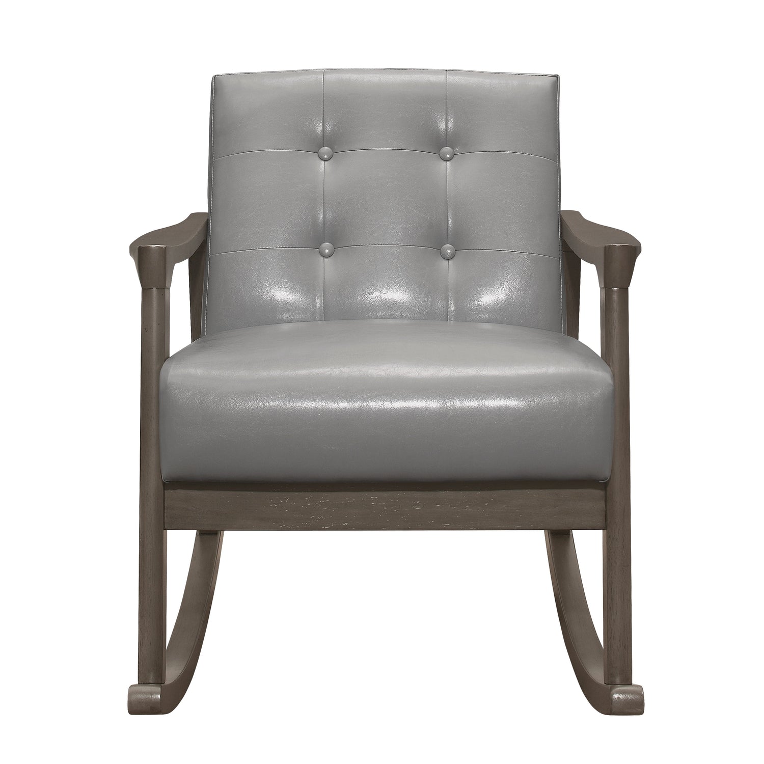 Mid-Century Modern lines define the profile of the Auden Collection rocking chair. Contoured arms top the framing of the rocker rails. The button-tufted backs and plain seat of the chair are covered in gray faux leather upholstery, with gray finish over solid wood.