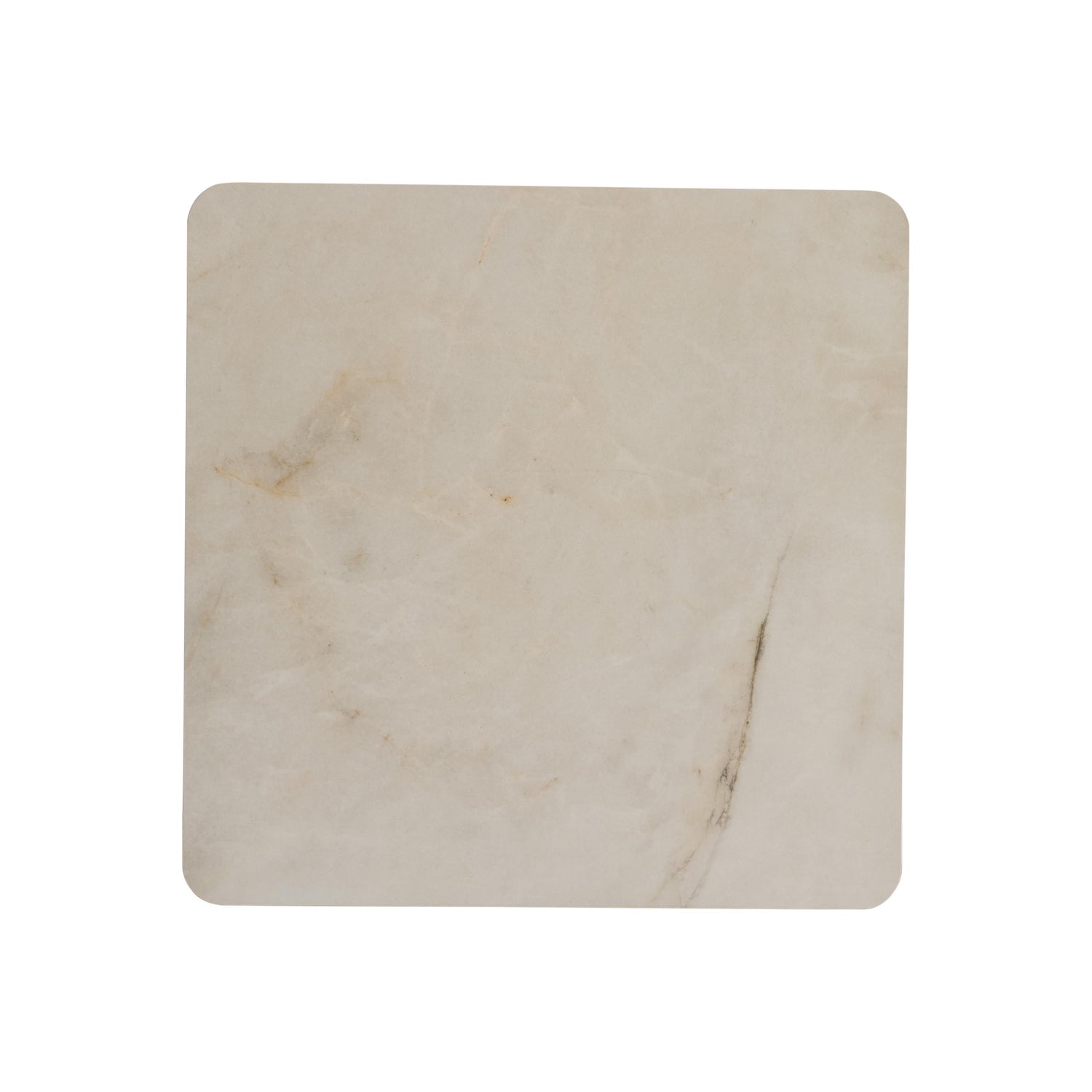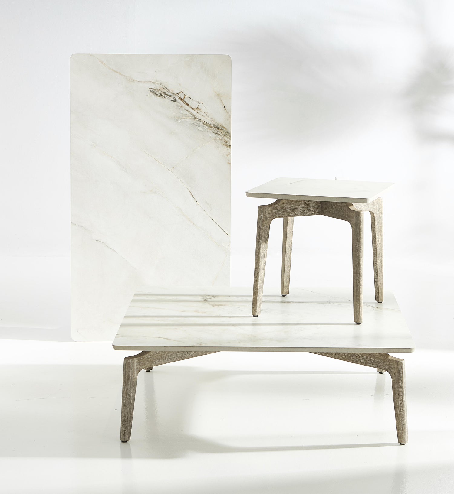 - Honed Vasta Stone table top in Warm Shale finish, supported by teak base in Sea Oat finish