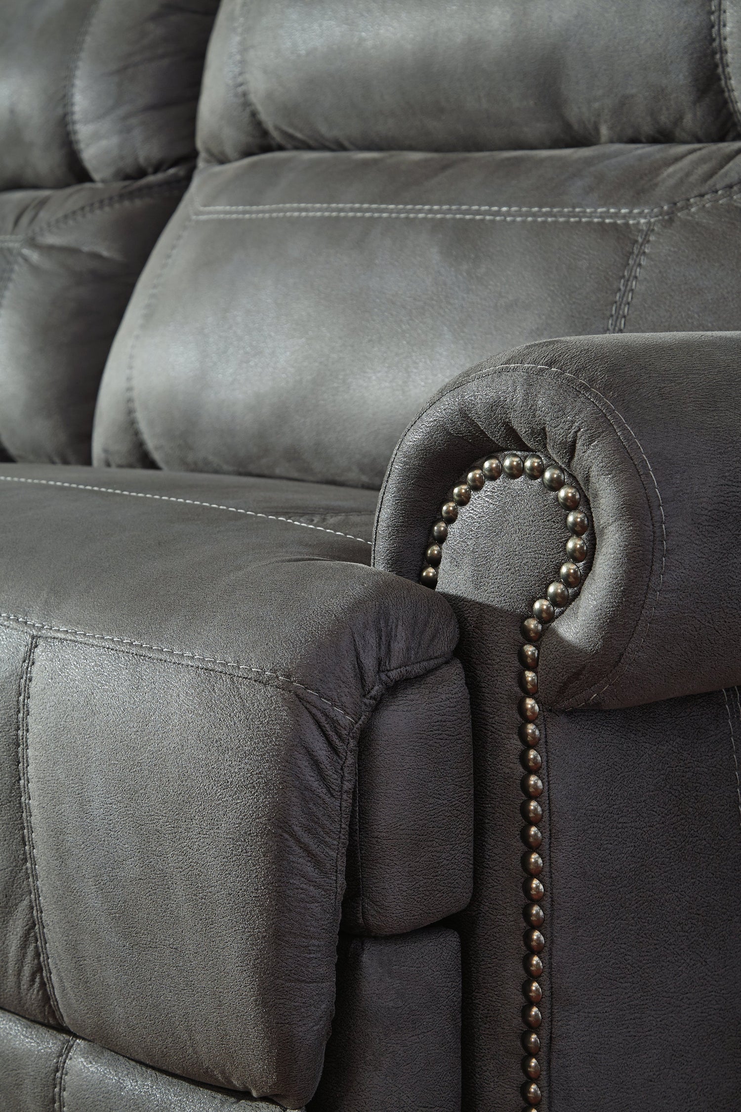 Sparing that "puffy" look you might expect from a recliner, this reclining sofa doesn't hold back when it comes to contemporary style. Subtle touches such as sporty jumbo stitching, nailhead trim and a "weather worn" effect on the upholstery give this handsome piece a buttoned-up appeal and fresh feel.