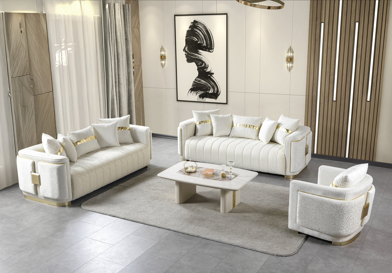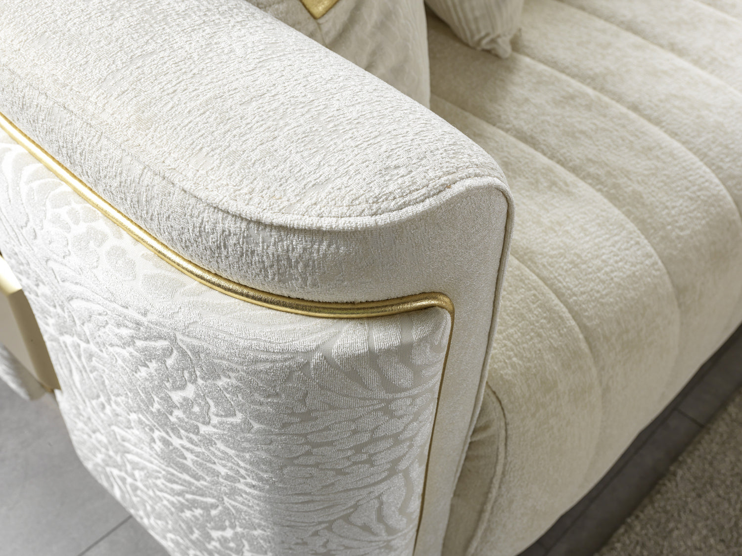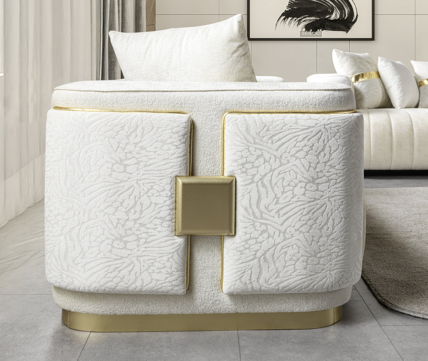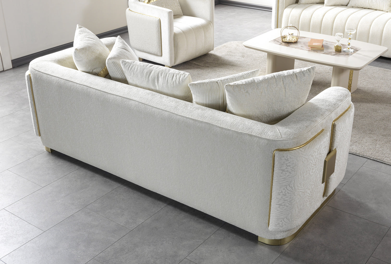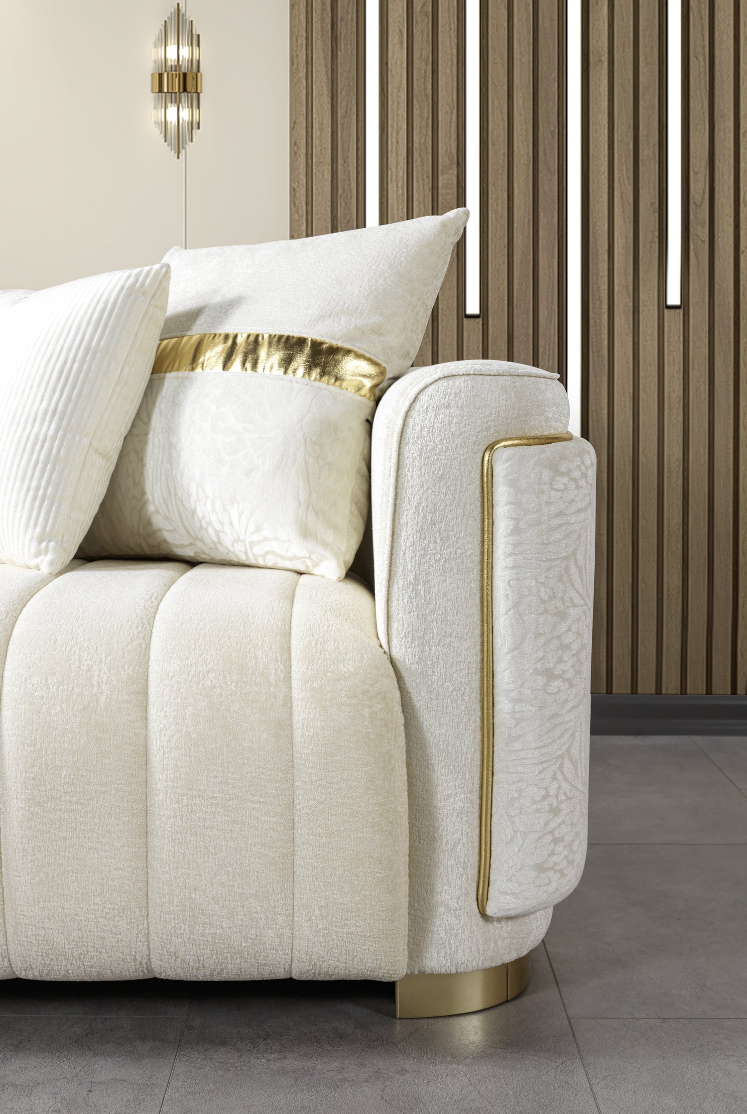 Bring both style and comfort to your home with the Avanos Cream Loveseat. Its sleek cream upholstery, plush cushioning, and gold accents create a luxurious touch, while detailed side panels and decorative piping provide depth and texture. Designed for intimate seating, it offers the perfect blend of elegance and everyday comfort.