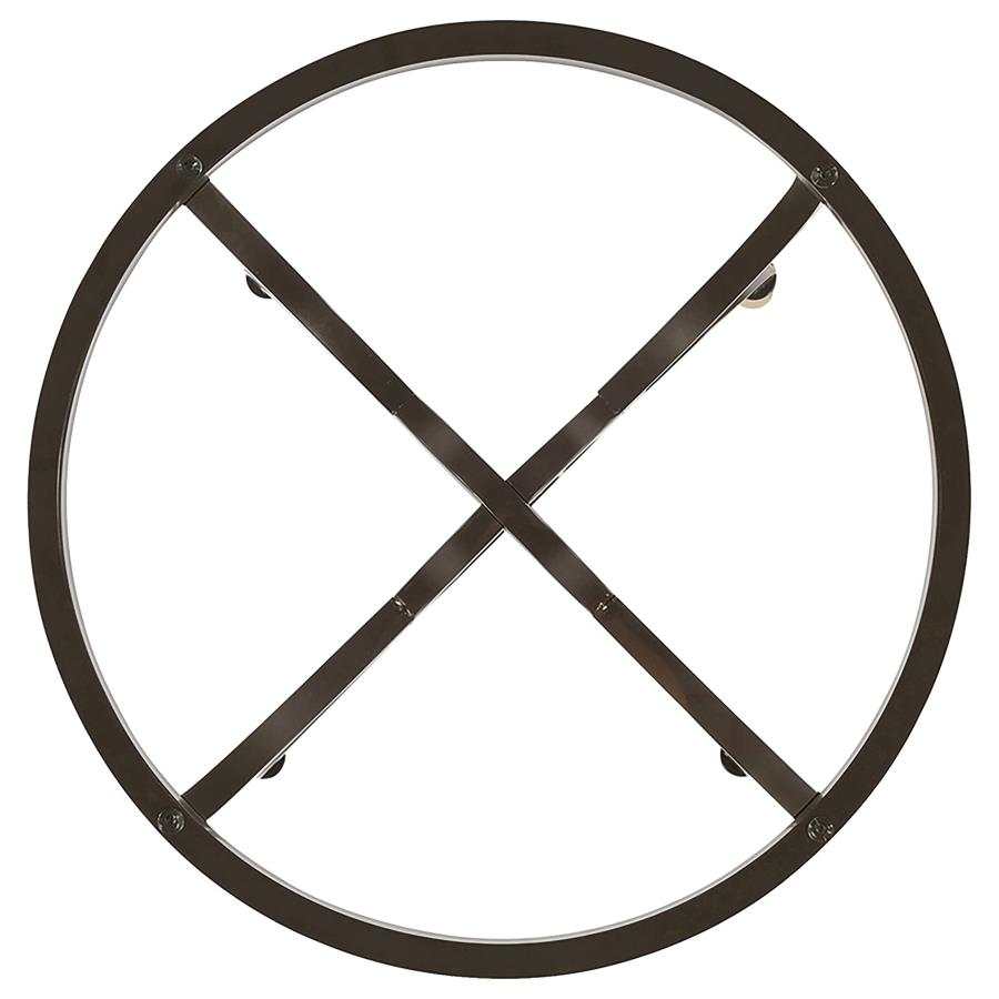 Curves abound on this intriguing transitional glass dining table. Featuring a casual and inviting aura, the table boasts a round of clear glass resting on a bold base. The base shows off metal construction with four stylized M legs that meet in an interlocking ring motif. A gunmetal finish lends a rich final touch. This 30-inch table is perfect for a stylish breakfast nook or eat-in kitchen.