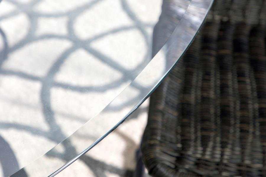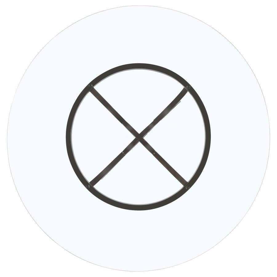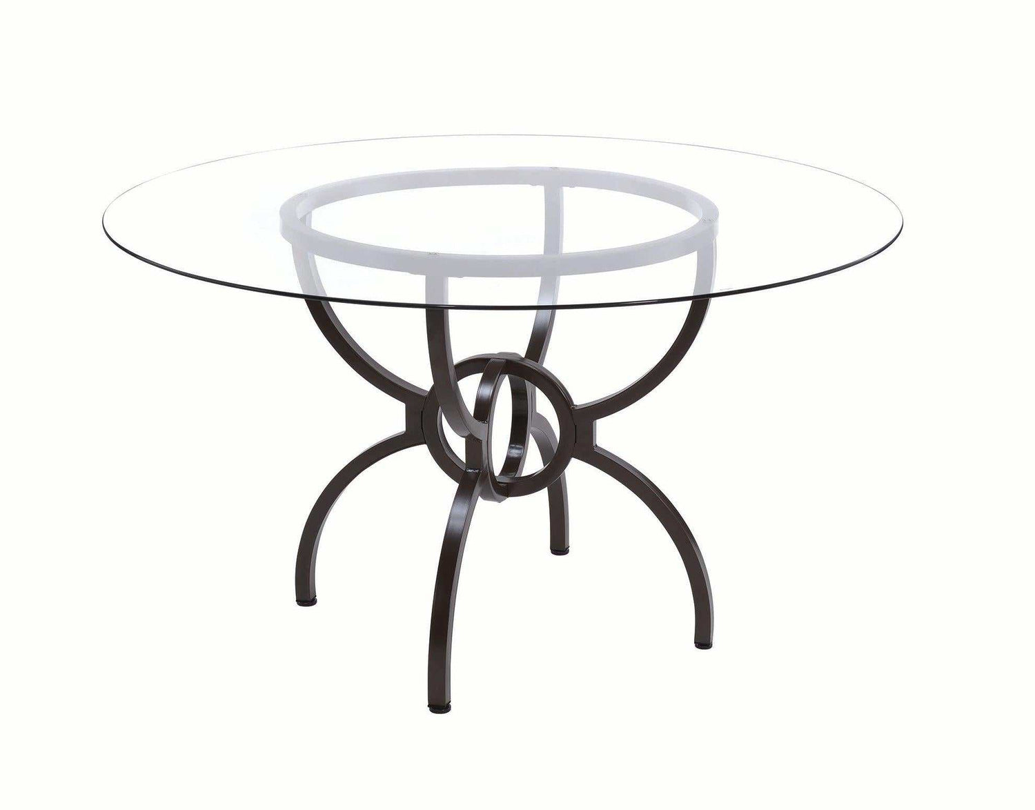 A meticulously crafted metal table base with elegant curvaceous legs converging around an interlocking ring waist, crowned with a 6mm 48" diameter clear tempered glass