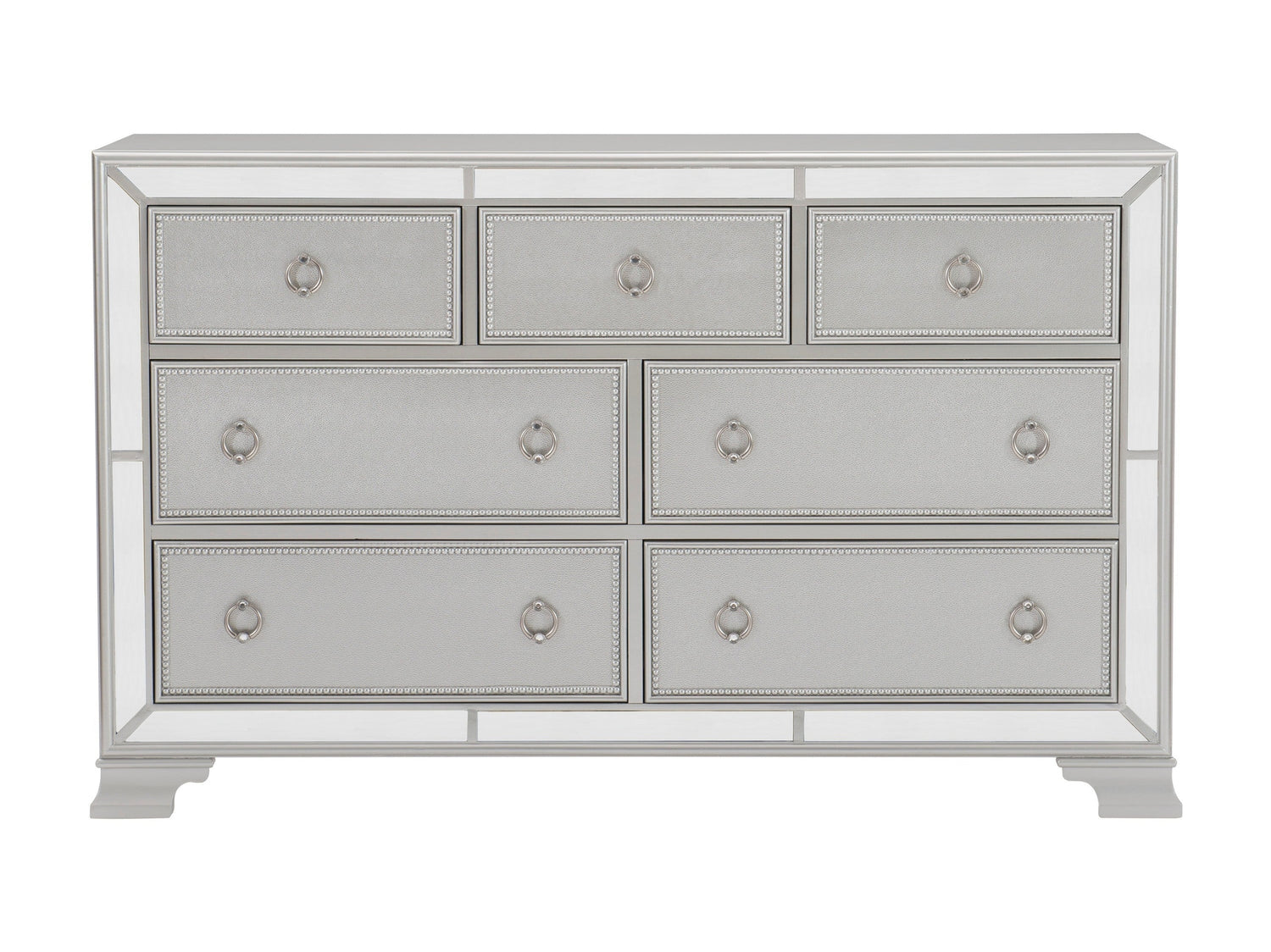 The reflection of your glamorous image is one of striking style and classic sophistication, all illuminated by the boldly designed Avondale Collection. Mirrored framing immediately draws your eye to the modern-traditional profile. Silver finished drop pull hardware centers each bead-molding adorned drawer front.