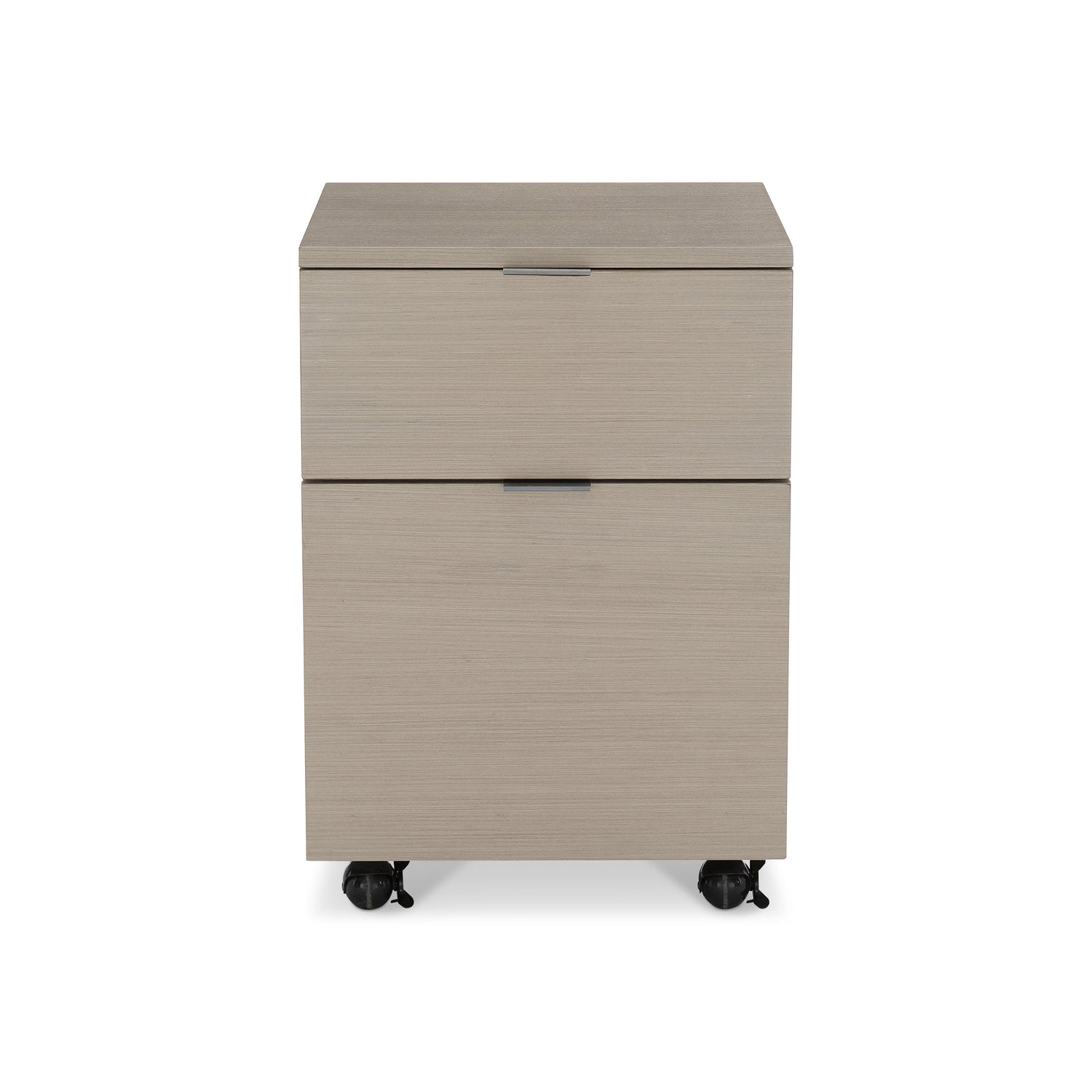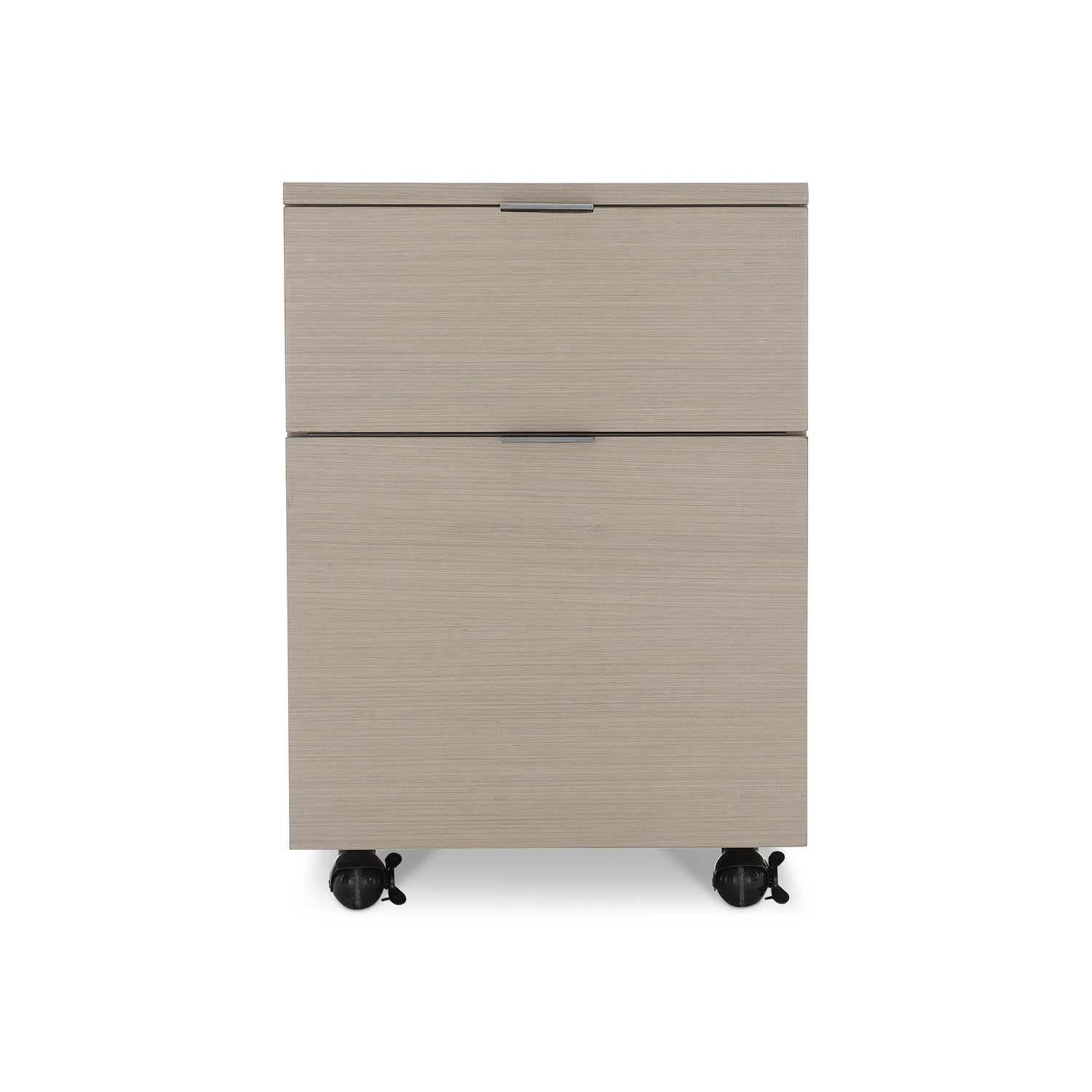 The Axiom file cabinet provides ample storage behind a no-fuss facade, making it highly functional as well as stylish. With two spacious drawers, it helps keep a workspace organized and uncluttered. Sleek metal hardware and a linear wood grain in Linear Grey finish create a look of subtle sophistication.
