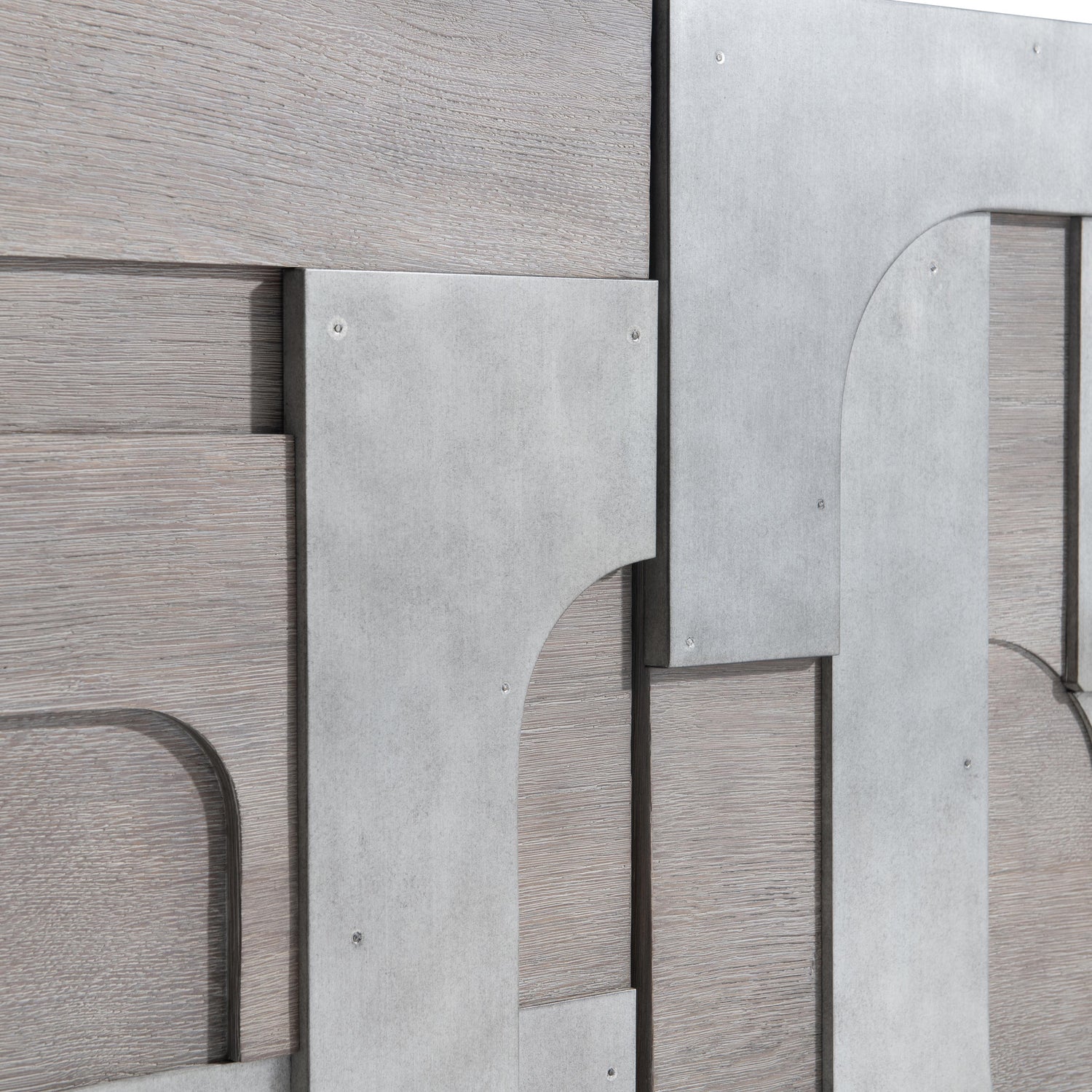 - Oak solids and veneers in Chai finish with exposed metal in Steel Dust finish