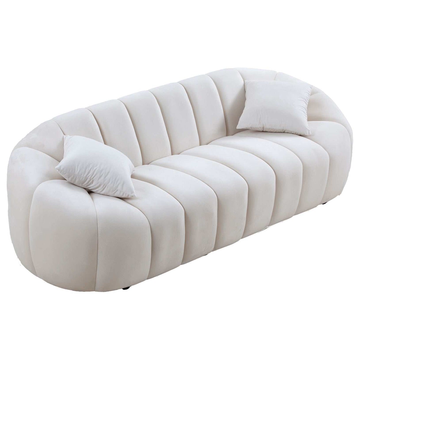 This is a beige 3-seater modern sofa designed to add sophistication to your living room or lounge area. It features deep channel tufting for visual depth and a luxurious waterfall effect. The sofa is upholstered in stain-resistant performance velvet for a plush and comfortable seating experience. It has a capacity of up to 900 lbs and rests on a rimmed base covered in matching velvet. The sofa is easy to assemble and offers a streamlined retro-modern look.