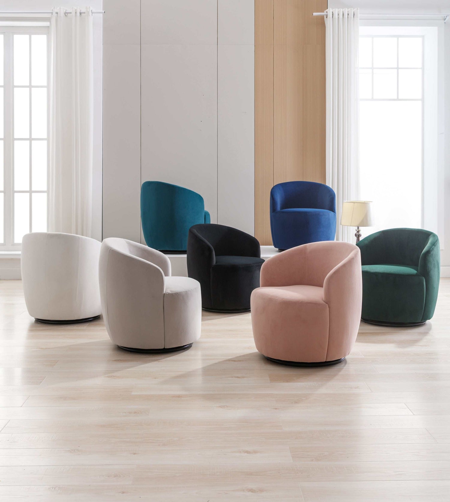 The plush velvet fabric exudes luxury and comfort, inviting you to sink in and relax. The added swivel feature provides flexibility and convenience, allowing you to turn and interact with ease. The distinctive black powder-coated metal ring adds a touch of modern elegance, enhancing the chair's overall aesthetic.