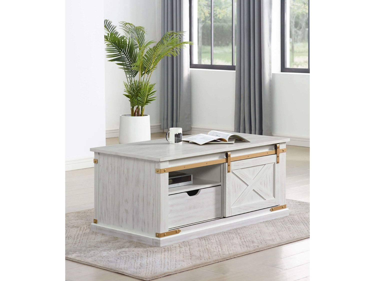 Celebrate your own personality and bring some real character to your home decor with this striking rustic-styled occasional table collection. Immediately, the eyes are drawn to the gold-plated metal details that frame the edges and corners of the tables perfectly. The high sheen meshes effortlessly with the antique white finish--a seriously glamorous take on a tried and true barnyard aesthetic.