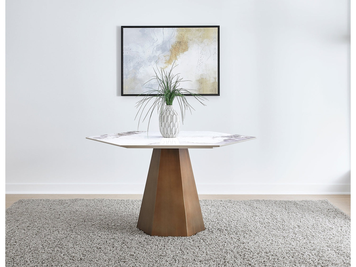 - Item Name: Balos Stone Top Hexagonal Dining Table in Chanelle and Bronze