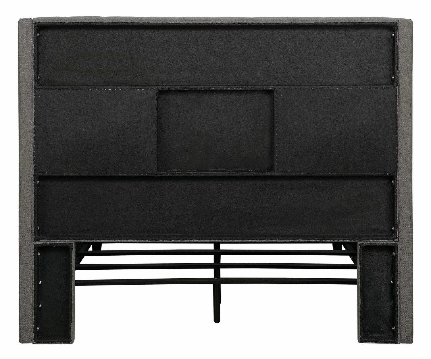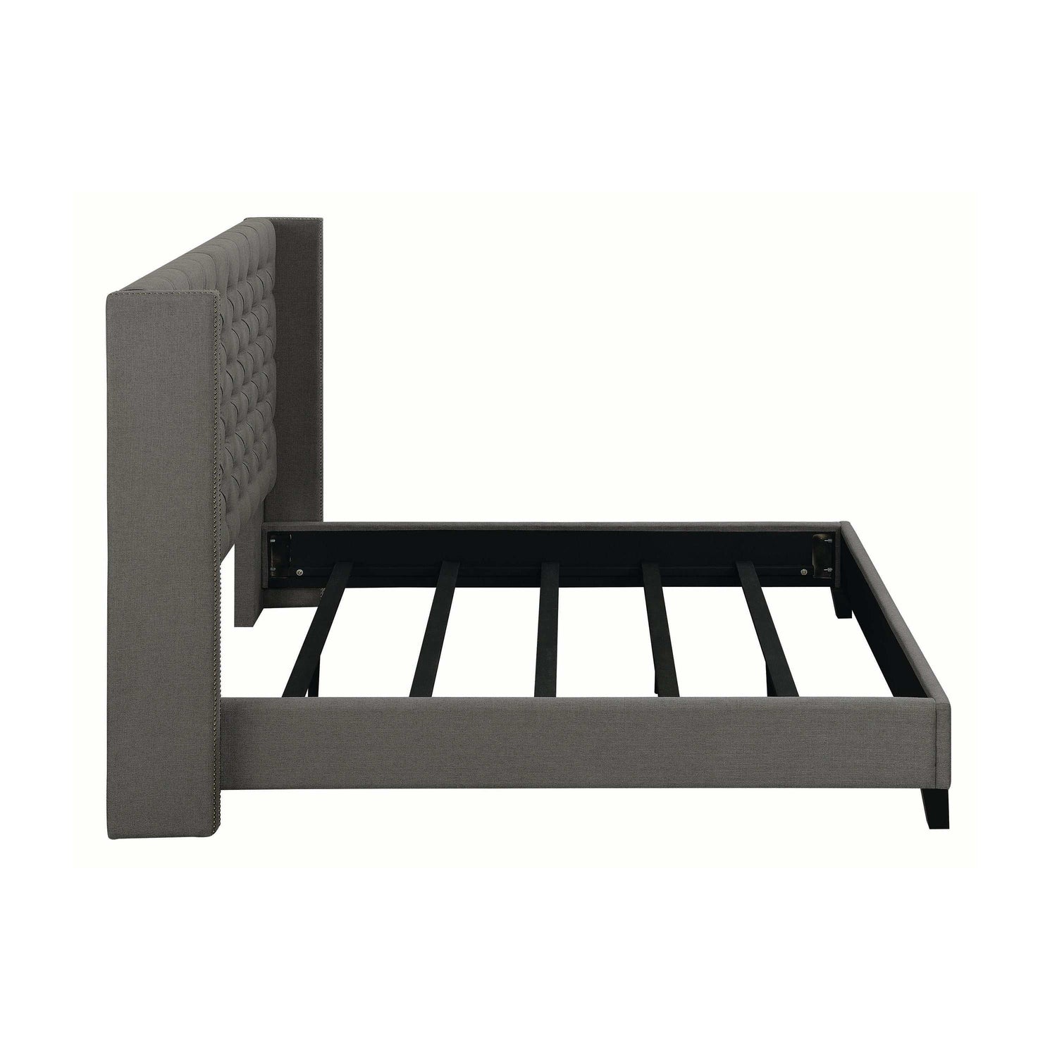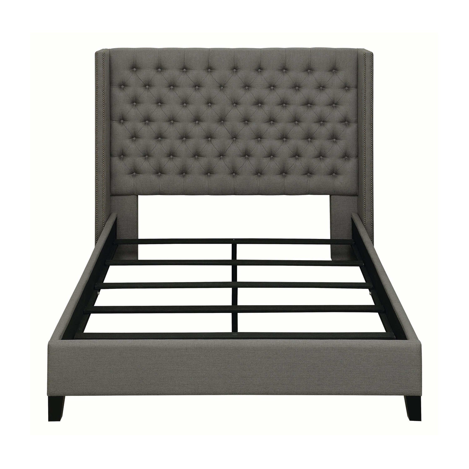 With a stately and sophisticated design, this California king bed frame exudes stylish appeal. It lends a touch of luxurious opulence to the decor of any master bedroom. Its tall, handsome headboard creates an elegant contrast to its sleek, simple base. Classic button tufting gives it an added edge of refined glamour. This magnificent bed is upholstered in soft, grey fabric for added softness and comfort.