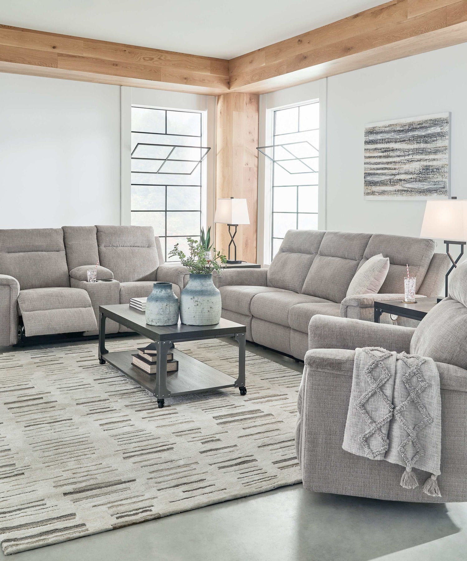 The ability to go from fully upright to relaxed and stretched out, all at the touch of a button, awaits. A beautiful blend of plush upholstery and casual style, this power reclining seating set invites you to sink into ultimate comfort. Whether you're hosting guests or lounging alone, you’ll find it hard to leave your living room—that’s a given.