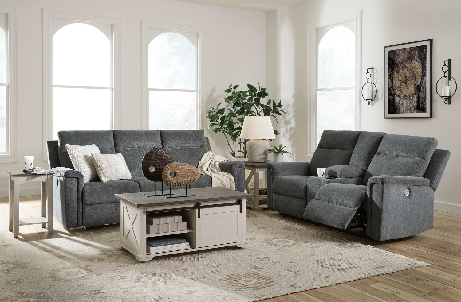 The ability to go from fully upright to relaxed and stretched out, all at the touch of a button, awaits. A beautiful blend of plush upholstery and casual style, the Barnsana power reclining package invites you to sink into ultimate comfort. Whether you're hosting guests or lounging alone, you’ll find it hard to leave your living room—that’s a given.