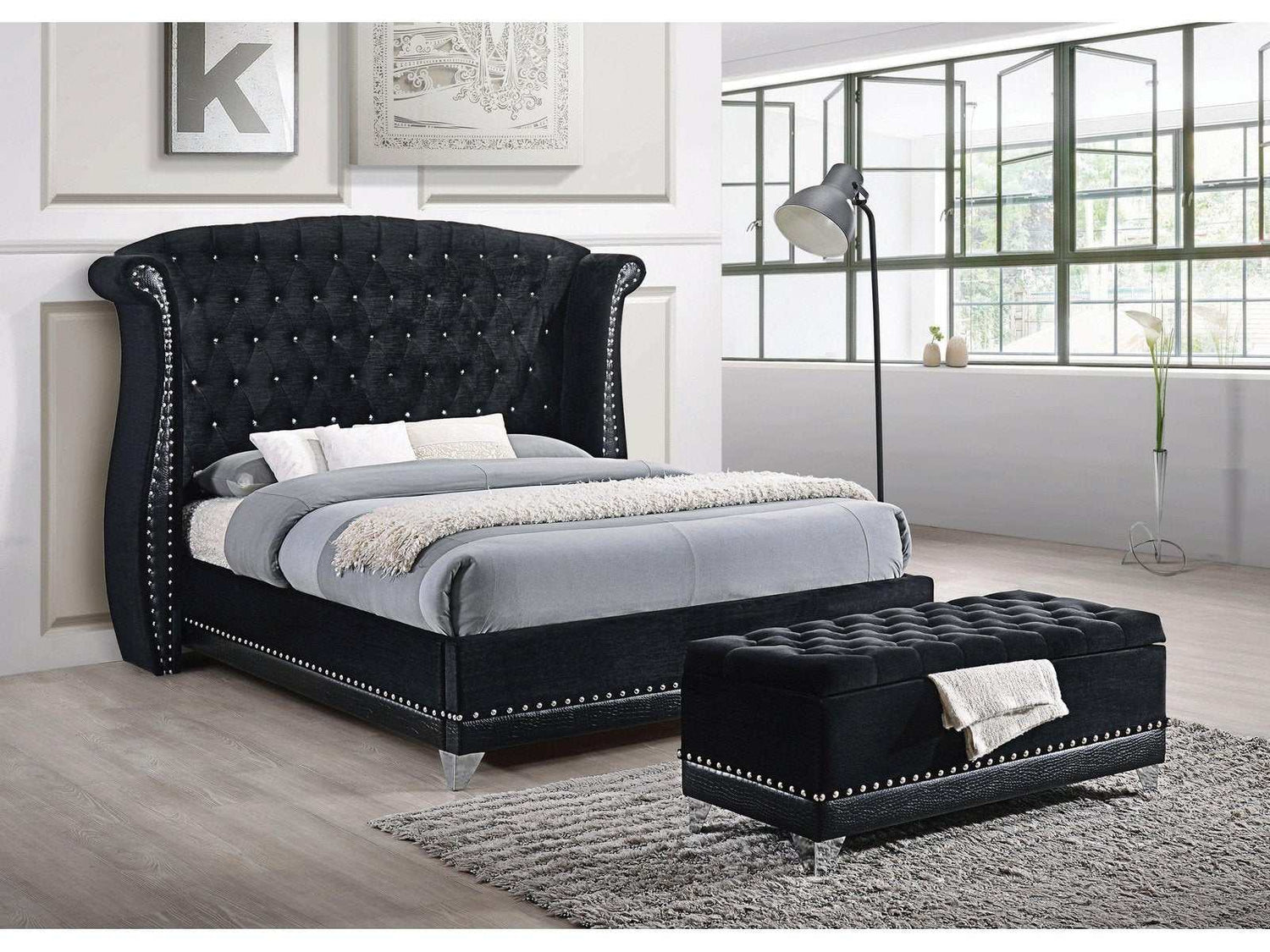 This magnificent bed is designed for sleeping in comfort and style. Headboard is constructed with button tufting and a wingback design that warmly embraces you. Bed is wrapped in sumptuous black with contrasting nailhead trim throughout. It's a bed fit for a regal setting. Note: a box spring is required for this majestic bed.