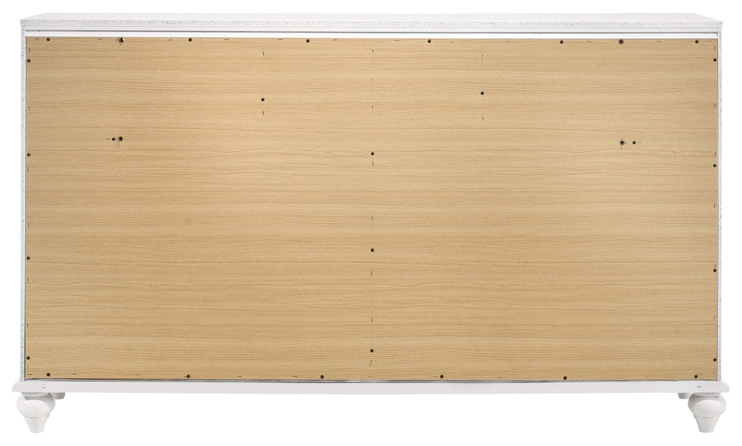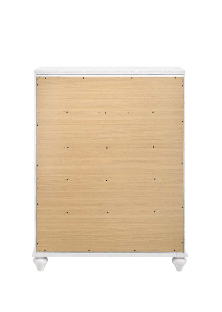 Exceptionally designed for transitional bedrooms, this five-piece bedroom set includes a panel bed frame, single two-drawer Nightstand: , five-drawer chest, and seven-drawer dresser with mirror , all in a crisp white finish with shiny metal hardware with faceted crystal accents. The paneled headboard and footboard offer channel tufted paneling wrapped in a metallic leatherette upholstery. Other extra touches include frame molding, turned feet, and felt lined top drawers. The Nightstand: offers a convenient power outlet for charging devices before bed. Place this bedroom set in a home to lend a more glamorous vibe.