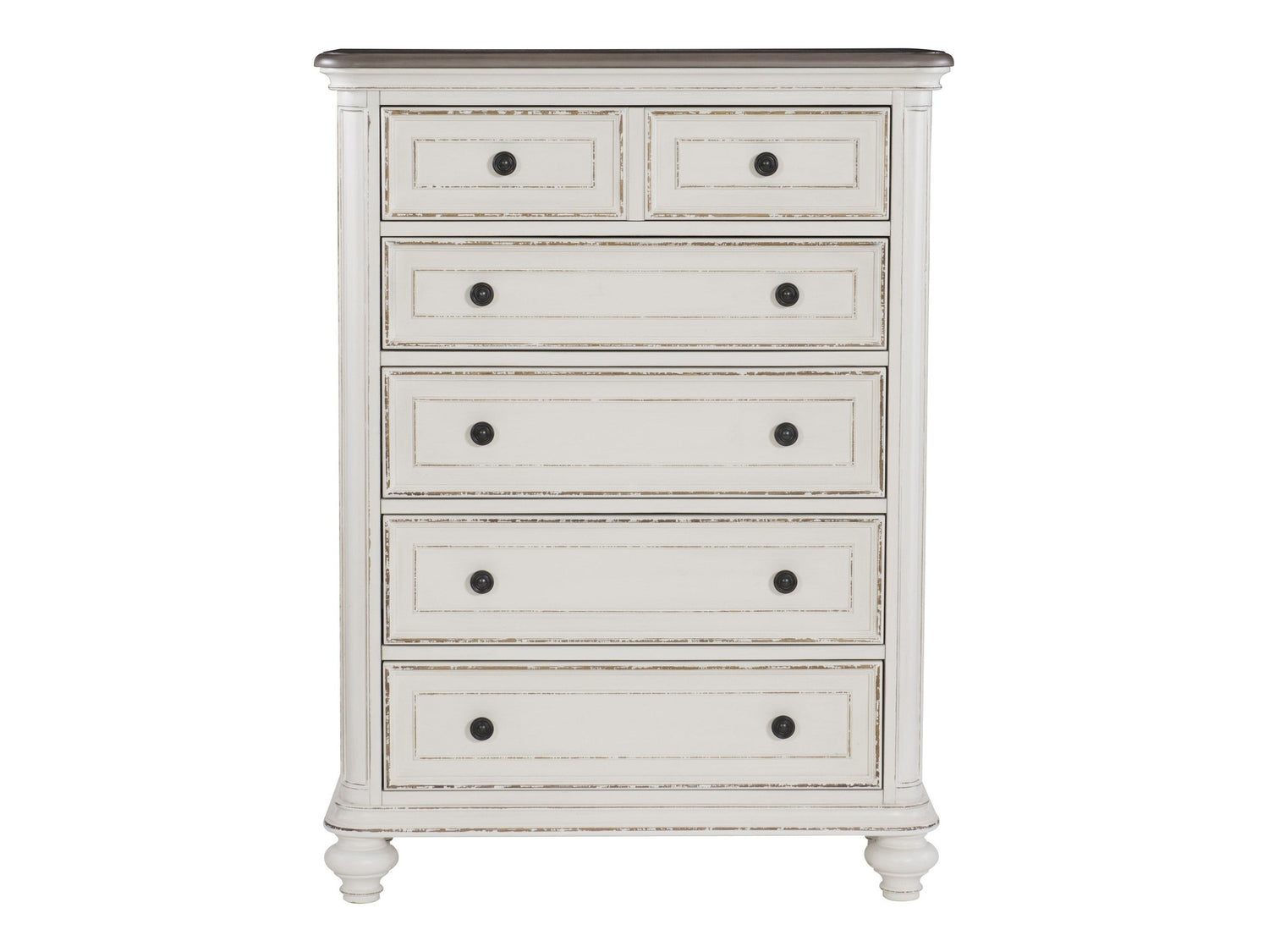 Soft, sweeping curves define the elegant profile of the Baylesford Collection. The chest is softened by an antique white rub-through finish with a brown-gray finished framed-plank top, creating a romantic aesthetic will place beautifully within your bedroom. Dark-finished metal knob hardware provides complementing contrast to the drawer fronts.
