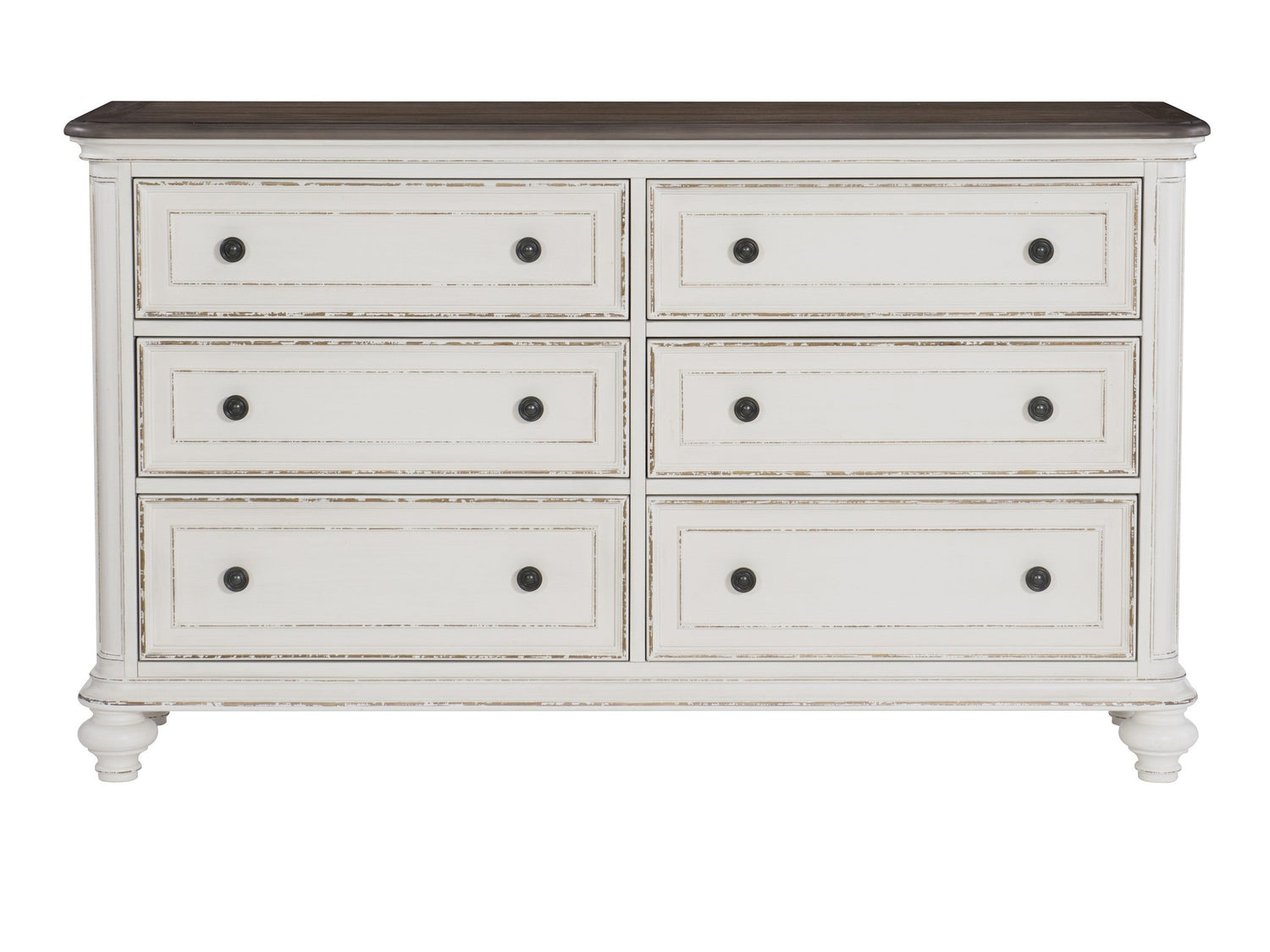 Soft, sweeping curves define the elegant profile of the Baylesford Collection. The dresser is softened by an antique white rub-through finish with a brown-gray finished framed-plank top, creating a romantic aesthetic will place beautifully within your bedroom. Dark-finished metal knob hardware provides complementing contrast to the drawer fronts.