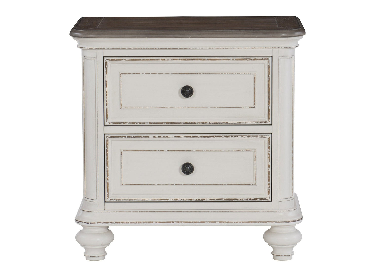 Soft, sweeping curves define the elegant profile of the Baylesford Collection. The nightstand is softened by an antique white rub-through finish with a brown-gray finished framed-plank top, creating a romantic aesthetic will place beautifully within your bedroom. Dark finished metal knob hardware provides complementing contrast to the drawer fronts.