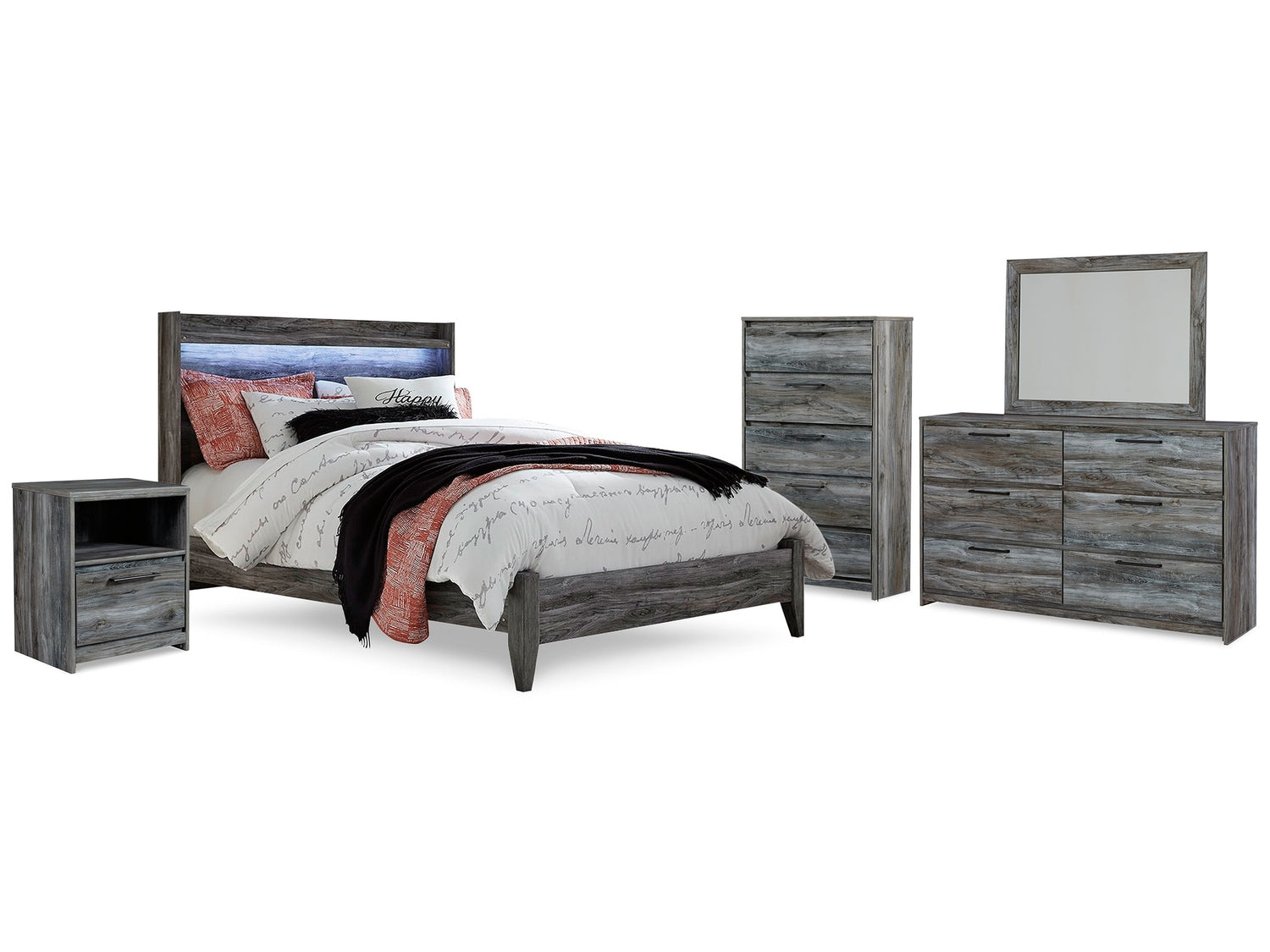 Baystorm Gray Queen Panel Bedroom Set with Dresser, Mirror, Chest and Nightstand