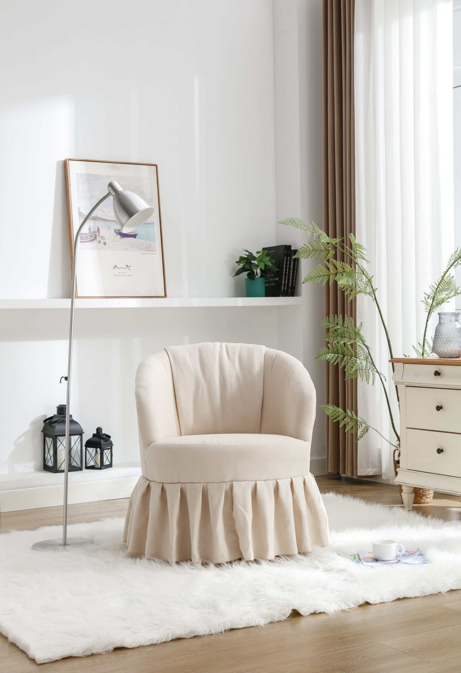 Upgrade your living room, bedroom, or even an auditorium with our sophisticated Linen Fabric Swivel Chair. The beige linen fabric upholstery exudes timeless elegance, complemented by a graceful pleated skirt. This accent chair not only adds a touch of refinement to your space but also offers the convenience of a swivel function. Its versatile design is perfect for various settings, from living rooms to bedrooms and even auditoriums.
