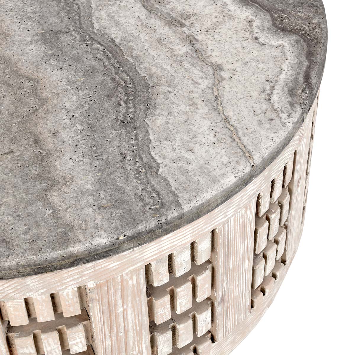 The Becky Reclaimed Pine 41" Round Coffee Table Timeworn Cream/Travertine is a versatile piece that combines practical design with a touch of elegance. Ideal for enhancing any room, its quality craftsmanship ensures it stands out in your home.
