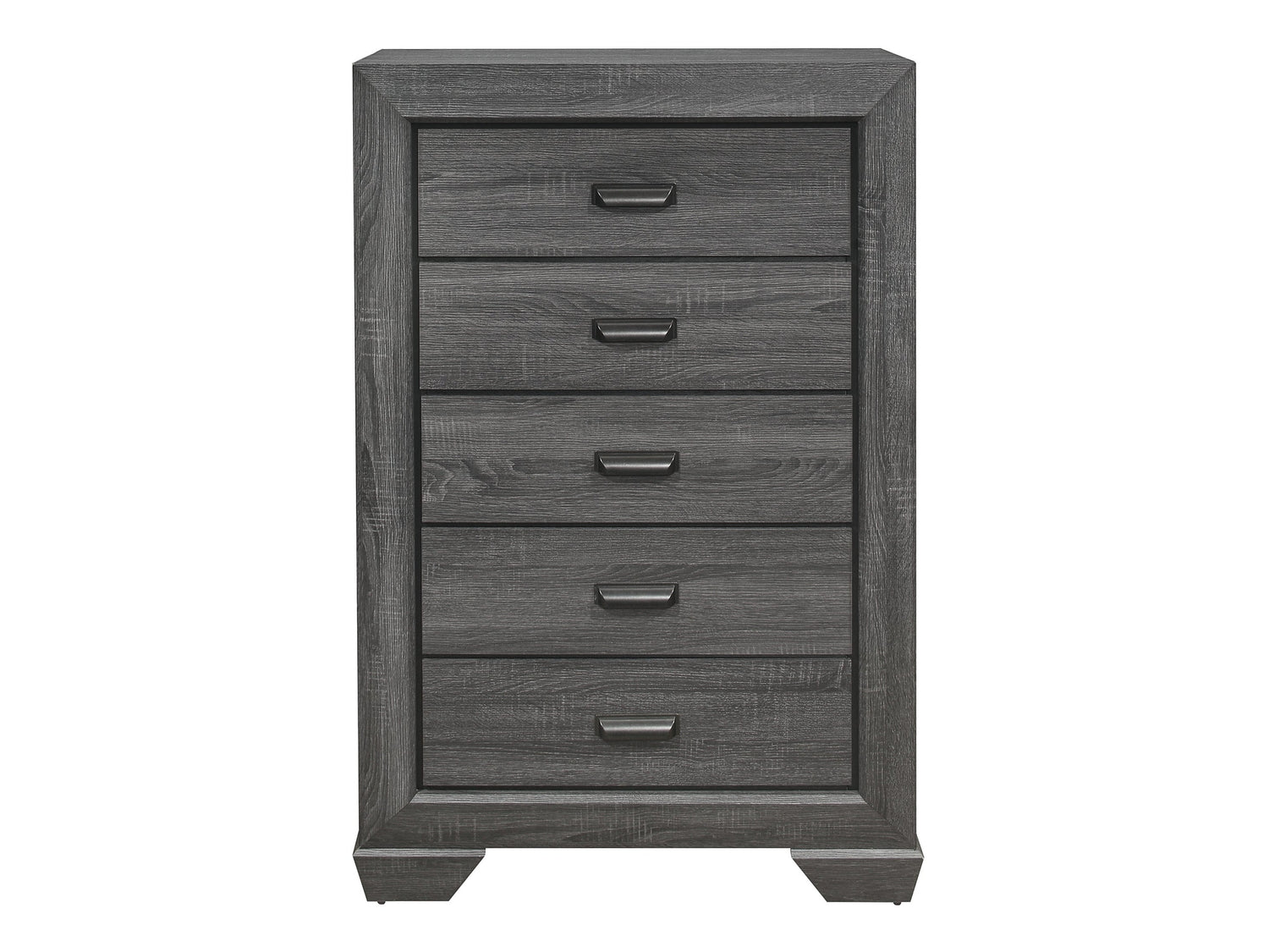 Blending the elements of contemporary design and rustic aesthetic, the Beechnut Collection is a unique addition to your bedroom. Dark under-paneling serves to highlight the gray finish enhancing the embossed faux-wood veneer of the chest's drawer fronts. Contrasting cup hardware punctuates each drawer front.