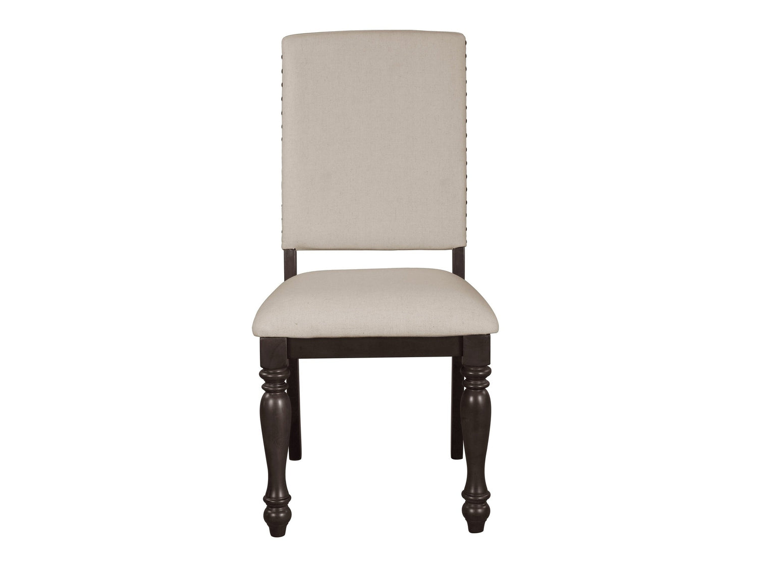 Casual transitional styling lends versatility to the placement of the Begonia Collection in a number of dining room settings. The grayish brown finish and traditional styling of the chairs lends distinctly to the execution of different looks from traditional to country casual. Neutral toned fabric chairs perch atop turned legs and feature nailhead accent that serves to define the chair back’s profile.
