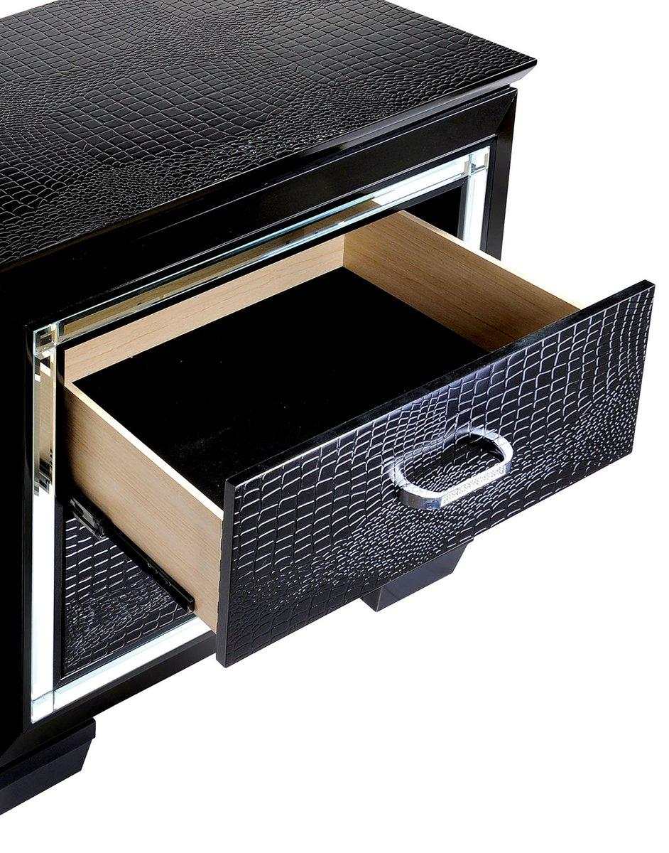 Specifically designed to accentuate a glamorous feel, this bedroom collection brings a combination of class and contemporary style to your bedroom. Crocodile embossed veneer and silver lining panels stand out throughout every piece while the button tufted headboard adds a charming effect. The headboard has built-in LED lights to illuminate the mood.