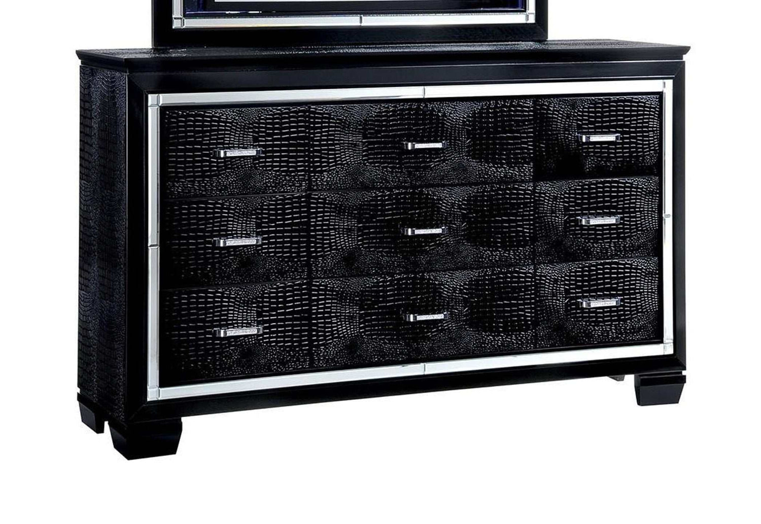 Specifically designed to accentuate a glamorous feel, this bedroom collection brings a combination of class and contemporary style to your bedroom. Crocodile embossed veneer and silver lining panels stand out throughout every piece while the button tufted headboard adds a charming effect. The headboard has built-in LED lights to illuminate the mood.