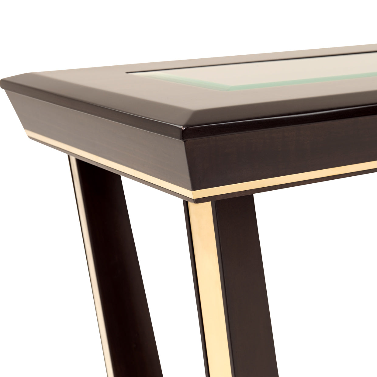 A study in modern glamour, the Belmont Place Console Table commands attention with its sculptural form and couture finishes. Crafted in a rich espresso veneer and framed with luminous gold accents, its bold geometry creates a refined architectural statement. The beveled glass inset top floats elegantly above the frame, reflecting light and adding a sense of airy sophistication. Designed to captivate, this piece transforms any space into a gallery of style.