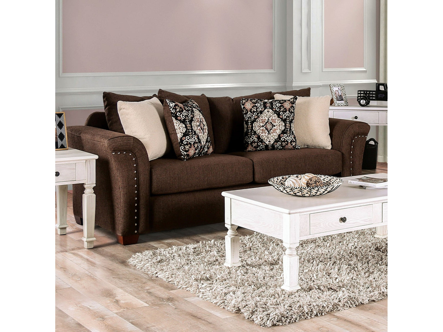 Flared arms that slope down on the sides and a dainty lining of individual nailheads give this set its classy appeal. Fully wrapped in linen-like fabric, the base frame provides a simple and bold silhouette, while the loose pillow backs add a few jagged contours in contrast to the sleek, curved lines of the frame. The throw pillows feature a variety of designs that give a striking contrast to the neutral upholstery of the pieces. And then there are a few more details such as the matching welt trim and the box seat cushions that offer unparalleled comfort