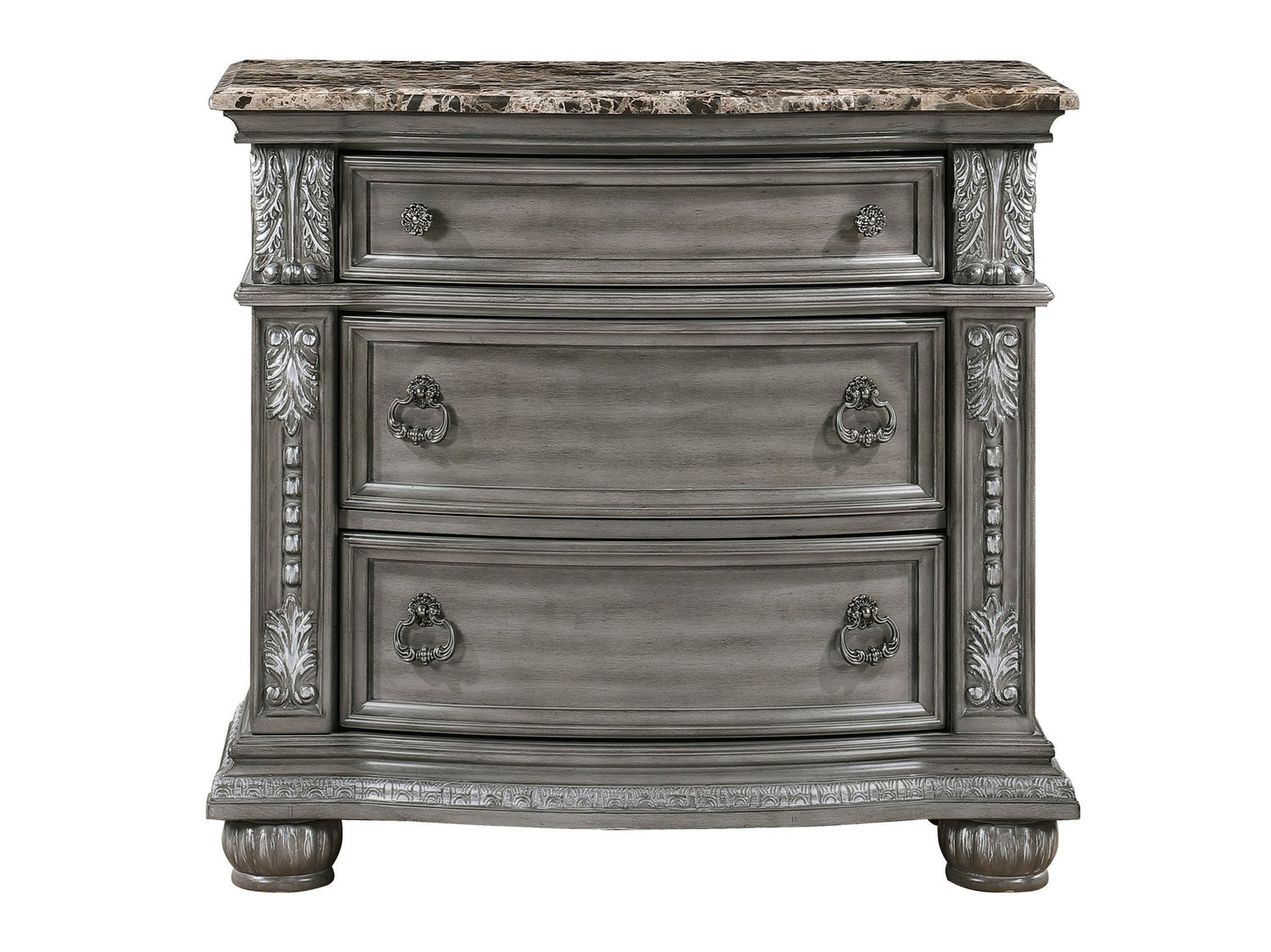 The luxurious grandeur that permeates the design of the Bennington Collection is an amalgamation of classic accenting and traditional lines. Carved bun feet, acanthus leaf carving, bead molding, and elegant framing account for the beautiful profile that defines the nightstand’s design. Antique pewter-finished knob and ring pull hardware fronts the drawers, and marble tops the piece. The gray finish, over acacia veneer, features subtle silver tipping for final luxurious accent.