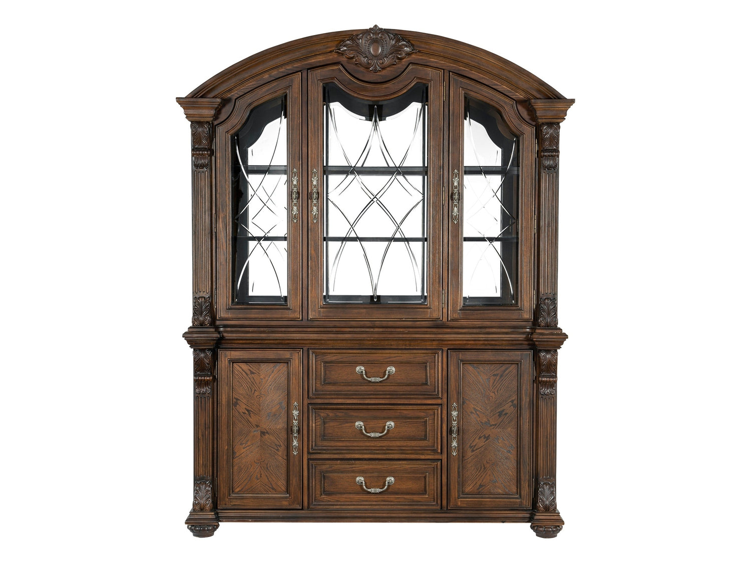 The grand scale of the Bergen Collection invokes a timeless aesthetic for your home’s traditional dining room. The dark oak finish highlights the distinct oak veneer of the collection, while also lending contrast to the decorative accenting of the curio’s design. Faux keyhole hardware fronts the doors of the china, while traditional bale hardware fronts the drawers. The glass doors of the china’s hutch allow for enclosed display of your tabletop accessories and decorative items while the base of the unit features wood doors that provide a closed storage option. Traditional accenting abounds throughout the piece with classic routed pilasters, moldings, and decorative pediments gracing the design.