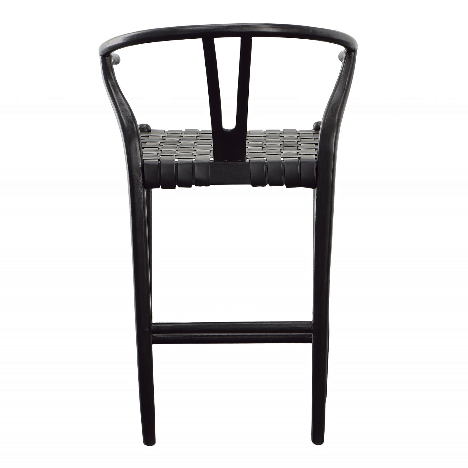The Bernice Counter Stool showcases a teak wood frame with a distinctive full grain leather weave, finished in antique black. This unique combination of materials offers a stylish and durable seating option, perfect for adding a touch of sophistication and comfort to any counter or bar area.